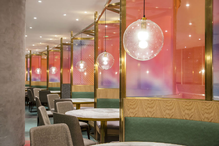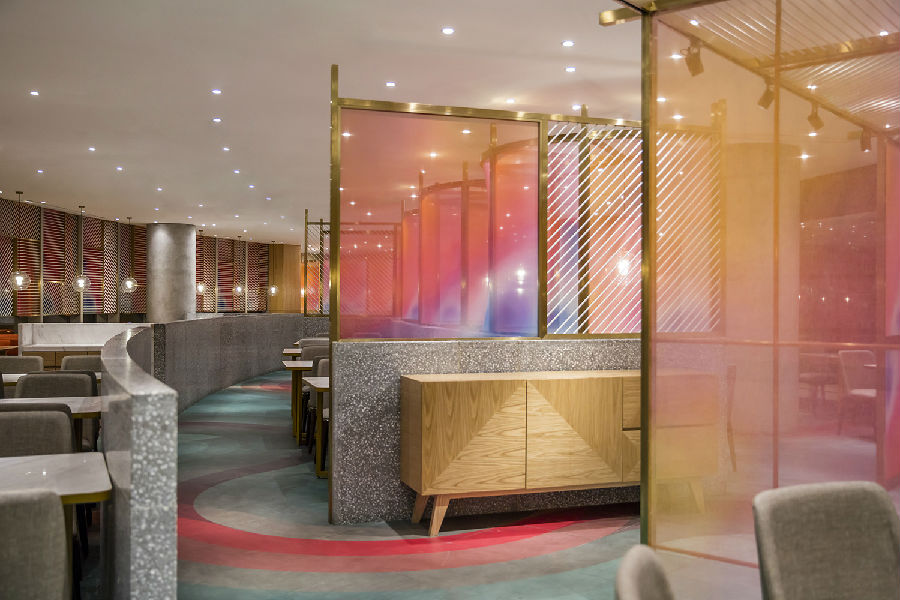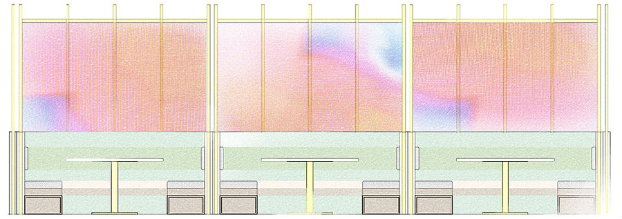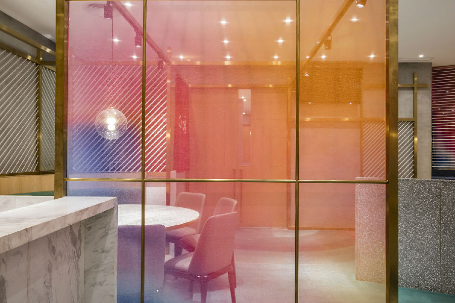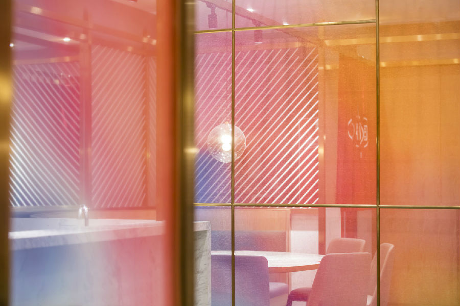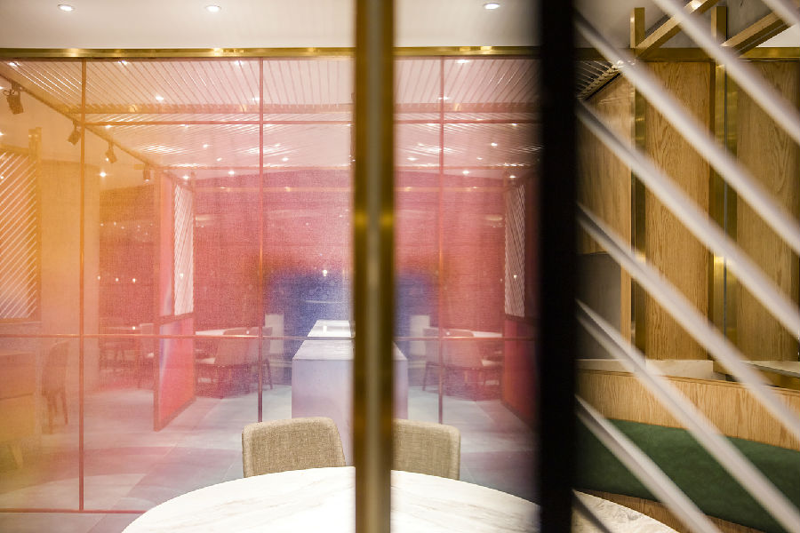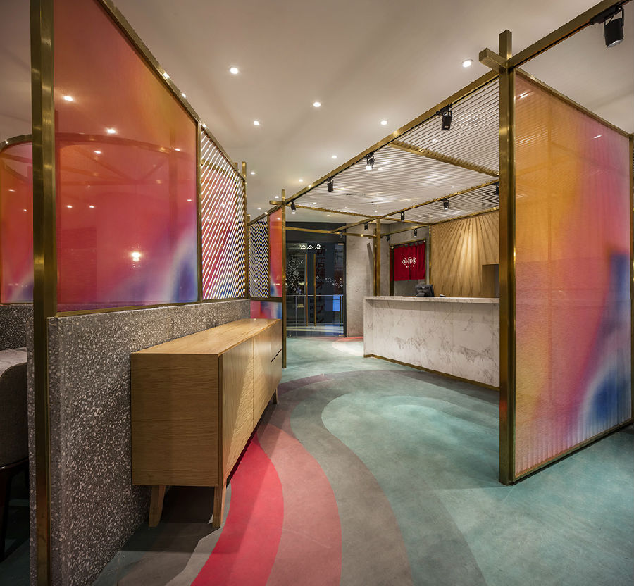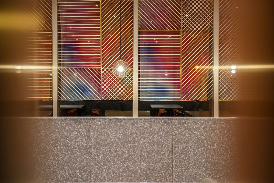 商场中每家店铺竭力花哨,所有餐饮店面外立面色彩纷杂,都希望从众多店铺中脱颖而出,让客户可以从很远的地方就可以看到,而我们在设计新店时力图通过简洁干净的外立面设计,以一种清朗的视觉效果呈现于整个商场之中。原有餐厅内部大面积窗户采光过于单调,而且户外的强光照射使得现在的室内空间较暗,室内外光比较大,为了整个空间的采光效果及视觉的舒适度,我们增加了轻盈的格栅,既达到适当的遮光,同时又烘托整个空间,与整场空间中使用的彩色纱染相互映衬。
