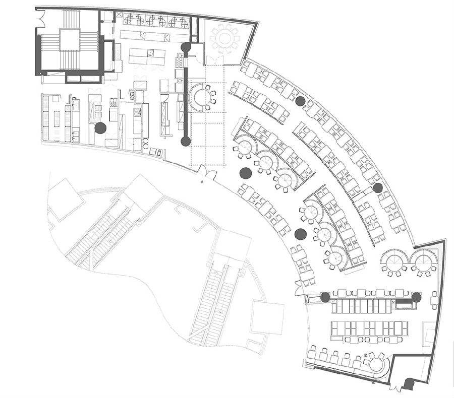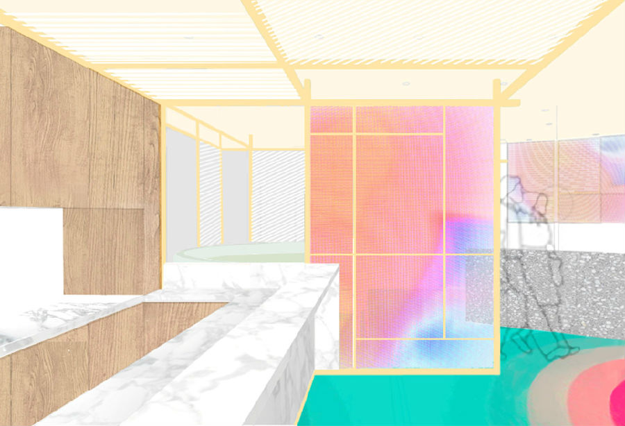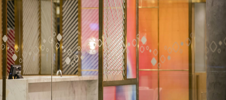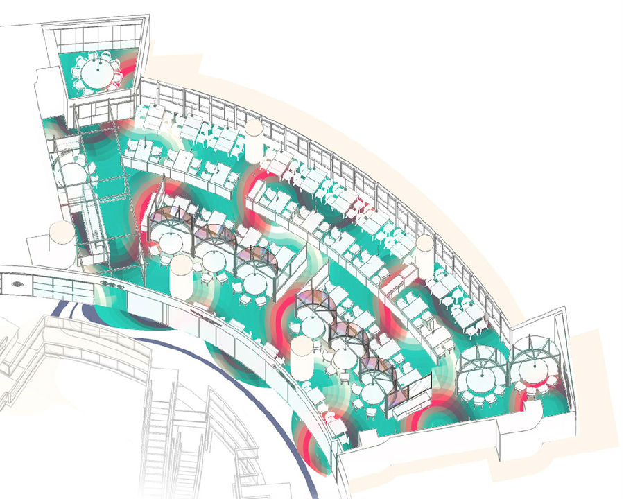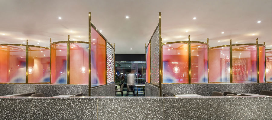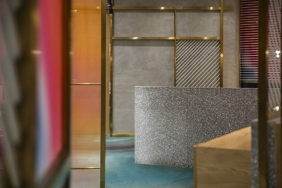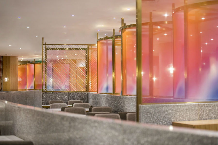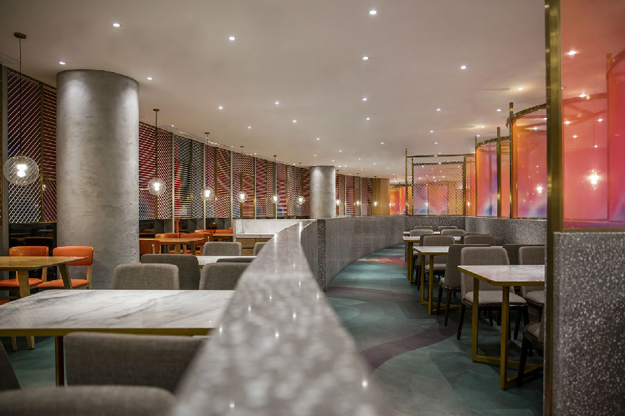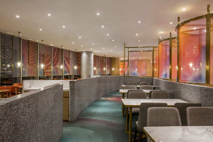 商场中每家店铺竭力花哨,所有餐饮店面外立面色彩纷杂,都希望从众多店铺中脱颖而出,让客户可以从很远的地方就可以看到,而我们在设计新店时力图通过简洁干净的外立面设计,以一种清朗的视觉效果呈现于整个商场之中。原有餐厅内部大面积窗户采光过于单调,而且户外的强光照射使得现在的室内空间较暗,室内外光比较大,为了整个空间的采光效果及视觉的舒适度,我们增加了轻盈的格栅,既达到适当的遮光,同时又烘托整个空间,与整场空间中使用的彩色纱染相互映衬。
