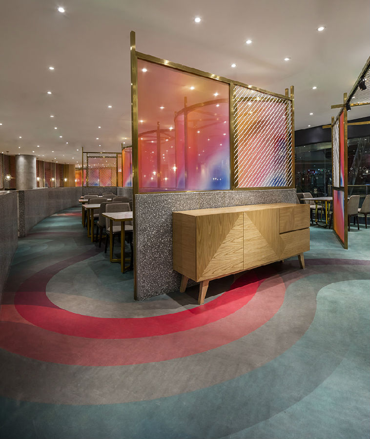 长宁龙之梦购物中心公共空间中地面流动的弧线作为导向设计,我们希望室内空间的内与外既有区分又能有某些联系。长宁龙之梦由于有三个不同的主入口,并分为红黄蓝三个颜色来区分三个主入口相应的中庭。我们的设计灵感也由此展开,原始平面特有的弧形也使得本次平面布置有别于以往的设计思维,新设计采用定制彩色地坪色彩叠加,达到地面整体统一融合的效果。流畅的图案使得原本枯燥的地面平面流畅自然散开、延续,成为本场设计的视觉焦点。