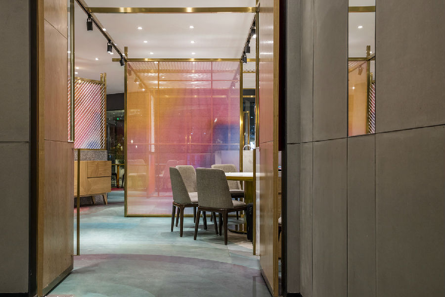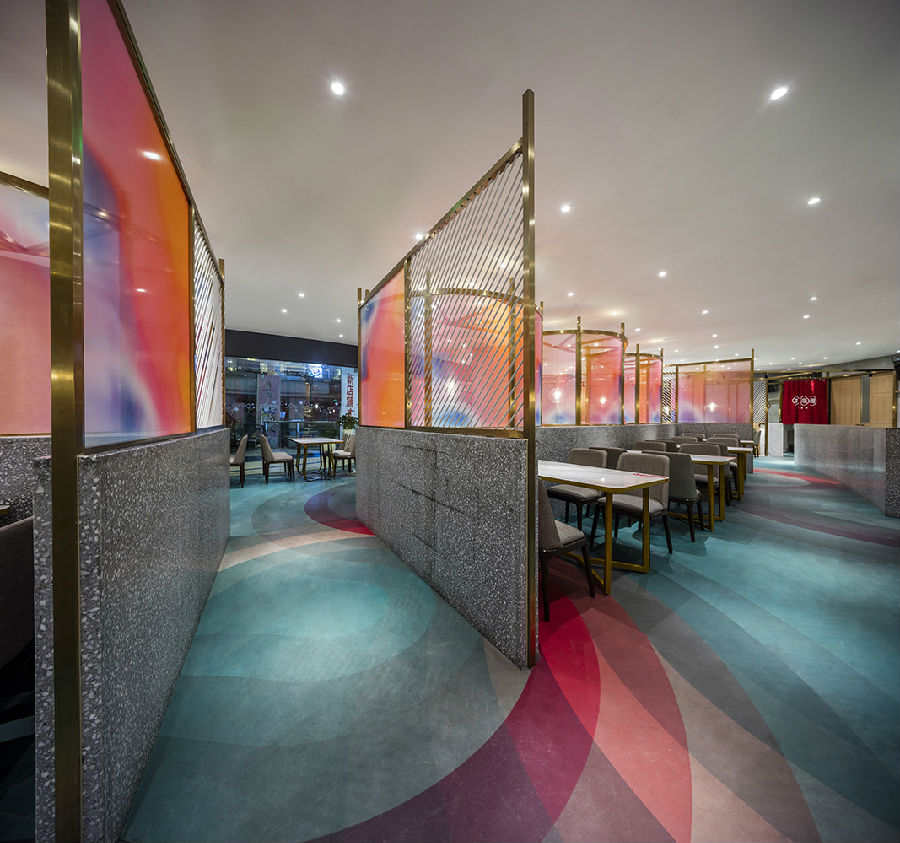 看过照片的人多会好奇以为染纱是玻璃贴膜,所以在我看来,很多设计不能只看照片,而是去到实地现场才是最直观的感受。好与不好,一目了然。在今天看来,固定染纱的不锈钢过于笨重, 另外在施工过程中地面未能保护好,实际现场呈现的效果一定不是照片这般精致的。诚然,望湘园能做到今天15年,在这个餐饮时代大潮里求新求变是必然。那份对家乡味道的念想大概也是他们的一种坚持和坚守。
