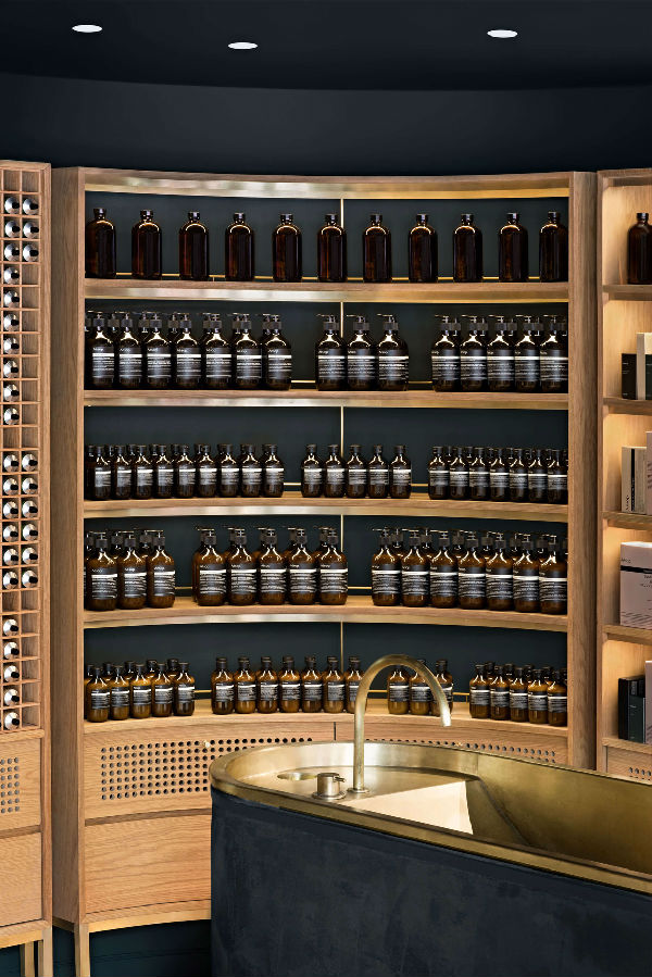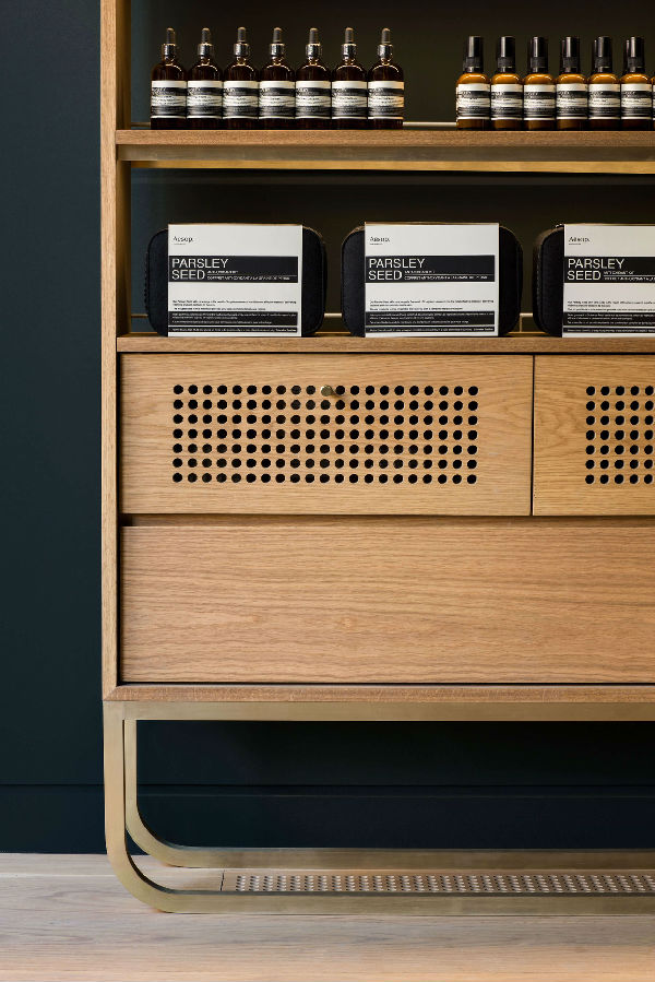 建筑设计师Alain Carle使用了深绿色的绒面革和黄铜的细节,把这家店护肤品品牌伊索(Aesop)店面打造成感觉就像一个爵士俱乐部。