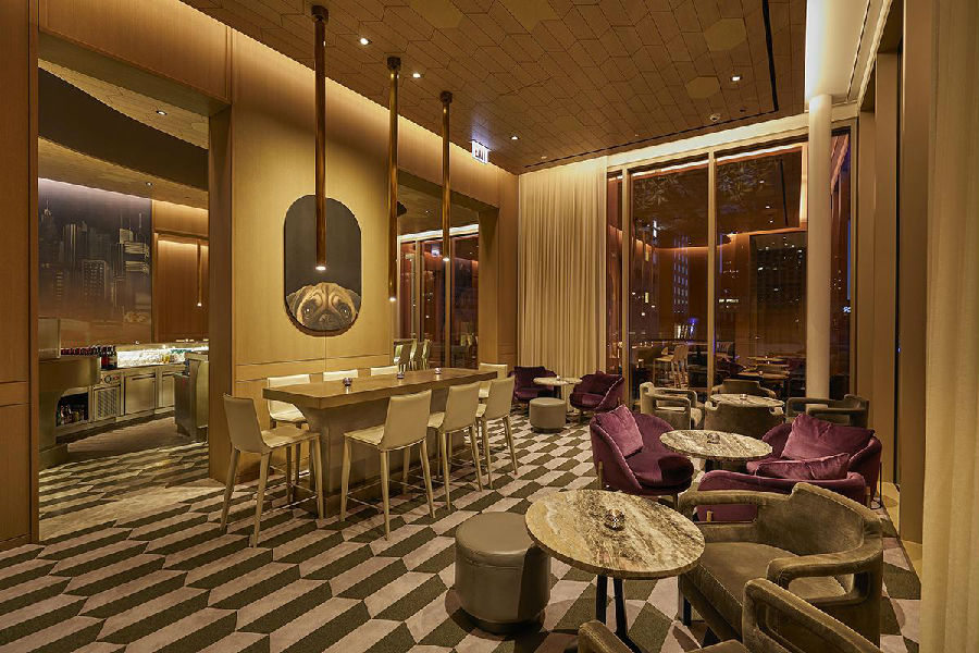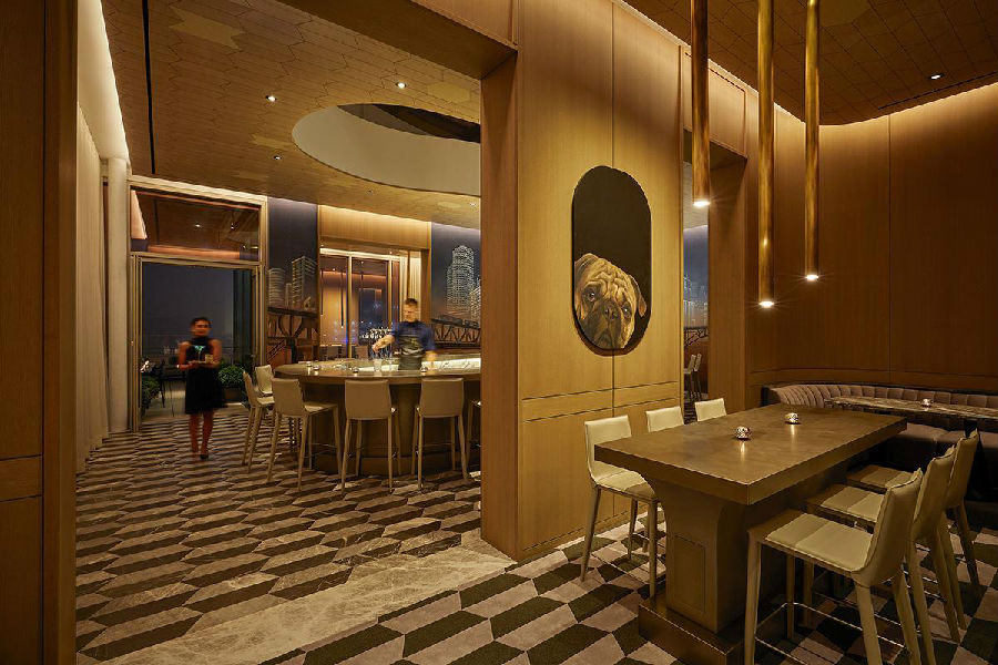 酒吧由一系列休息室组成,每个休息室都有自己的个性,旨在让顾客进一步探索内部空间。这间酒吧采用精致的纹理,大胆的图案和令人回味的艺术性设计,是餐饮和文化活动的理想目的地。风景秀丽的壁画,戏剧性的天窗,落地窗和哈巴狗的画作相结合,营造出视觉盛宴。