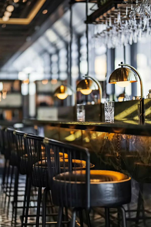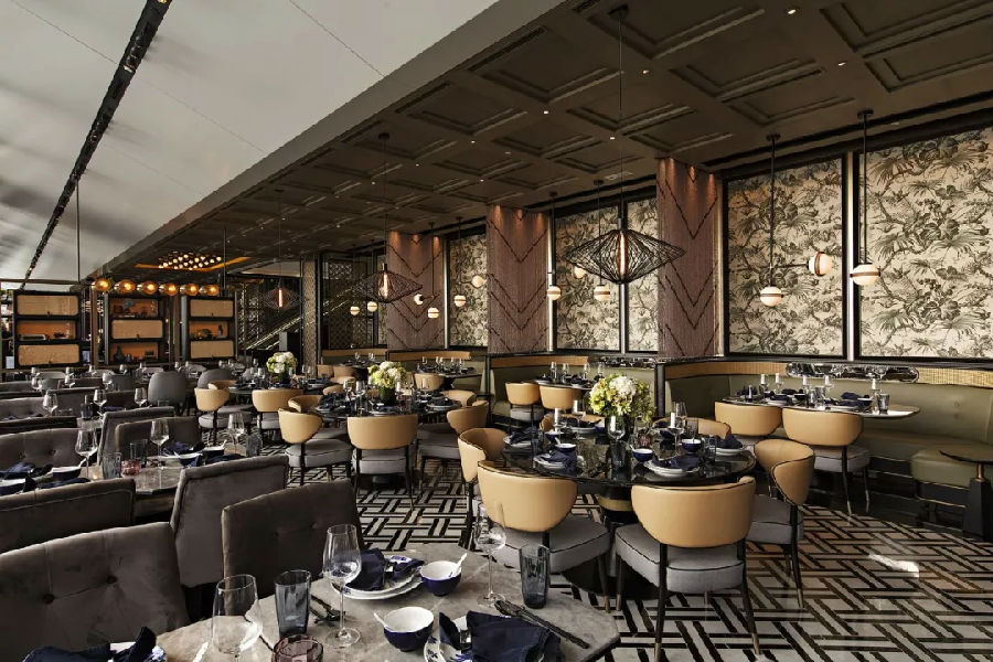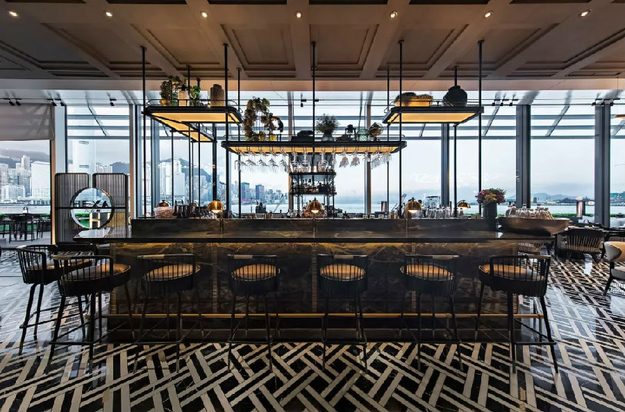 在空间布局方面,设计师将六公馆划分为两个区域,分别是以酒吧为中心的“Passion”及以家庭聚餐为重心的“Love”。Passion区域以深色为主调,地面铺设黑白相间的几何图案大理石,墨绿色云石的酒吧台则以古铜色的金属作装饰,加上同色系的灯具点缀,营造型格的氛围。