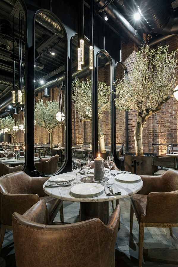 室内的宴会厅像家一样舒适 – 成型的深色天花板,枝形吊灯,黑色和蓝色的皮革家具,石墨镜子,最后还有一些金属框架的画作。简而言之,建筑师试图在这家餐厅营造出一种平静而愉快的氛围,以获得精巧别致的视觉感受。