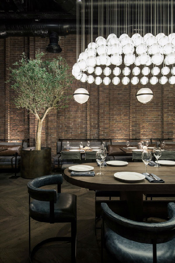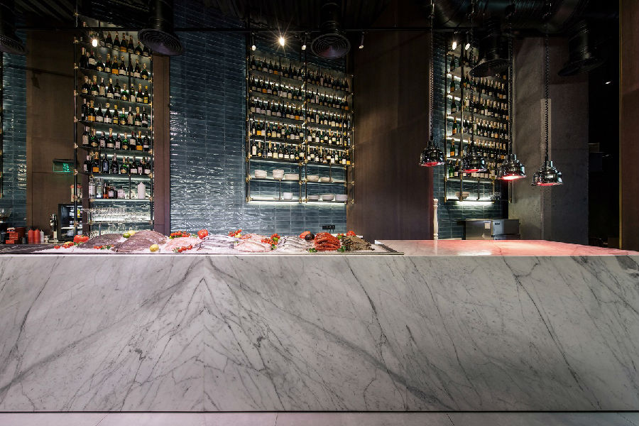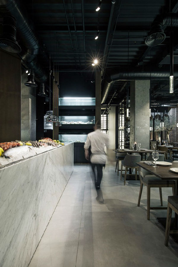 餐厅内部到处都是粗糙的未加工表面 - 复杂的砖砌,金属部件,混凝土柱。 由于这是一家纯粹的鱼餐厅,许多装饰细节都与主题直接相关。带有三层鱼缸的大型货架呼应了海洋的主题,大型酒吧的窗户直接敞开,新鲜的鱼在客人面前煮熟,甚至酒吧后面的透明单色瓷砖看起来都像海藻的颜色。