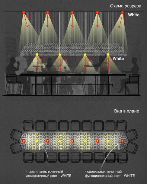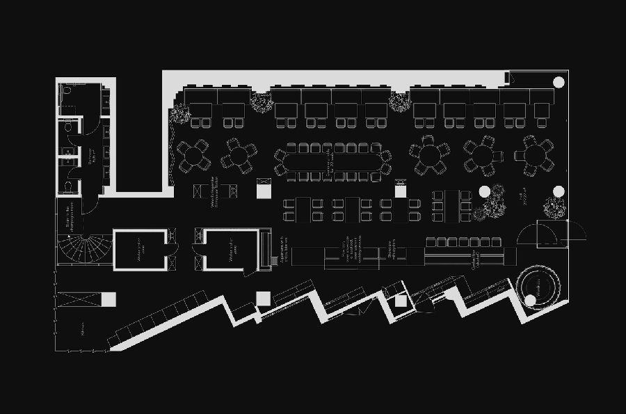 餐厅分为两层,一层为主厅,二层为宴会厅,而底层空间又分为两个区域 - 带公用餐桌的酒吧以及配有三米海鲜陈列柜,葡萄酒架和冰箱的三间主餐厅。