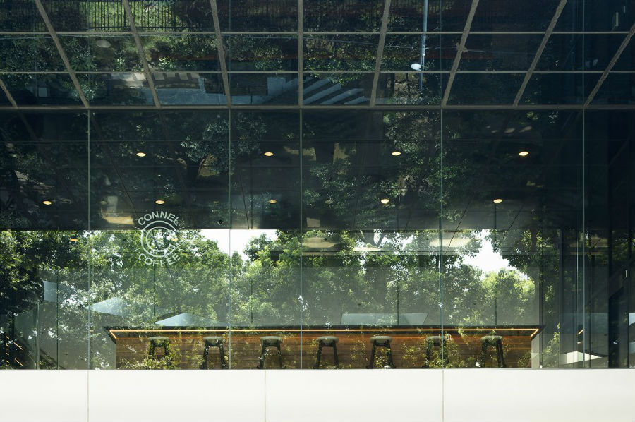 咖啡厅位于丹下健三设计的建筑中(nendo新办公空间占据了这栋大楼);拥有得天独厚的位置,室外临靠着Korekiyo Takahashi纪念公园,室内临靠着中庭中野口勇设计的石头花园,各处外景都极为美丽。整个设计为了尊重场所景观,未在空间中安放任何墙体,只重设了地板与家具。为了保持统一感,地面瓷砖的缝与楼梯和天花都是对应的。