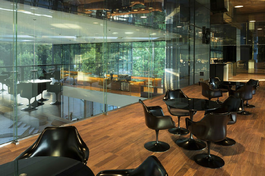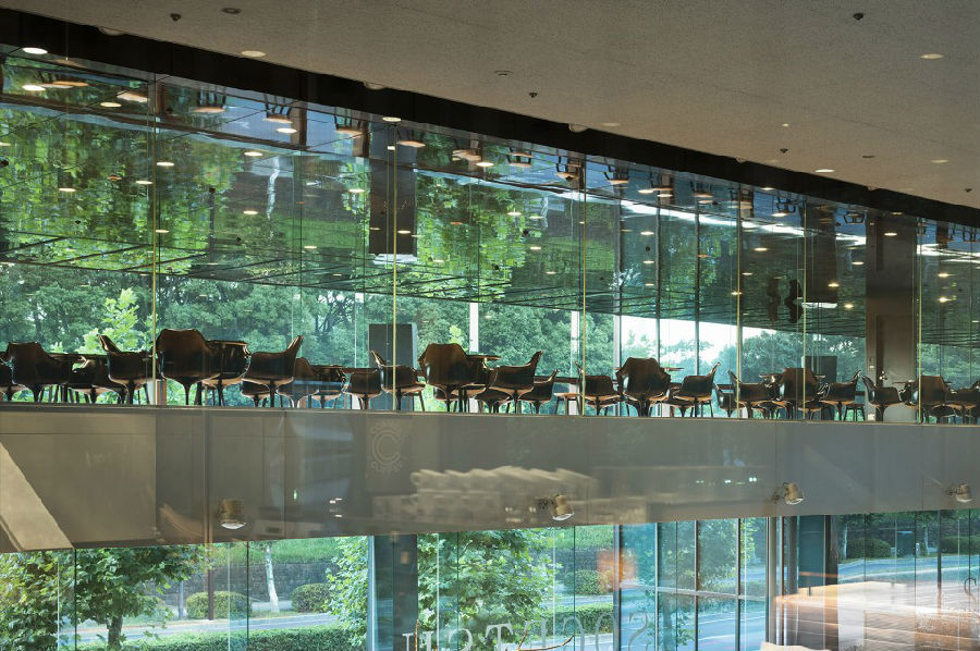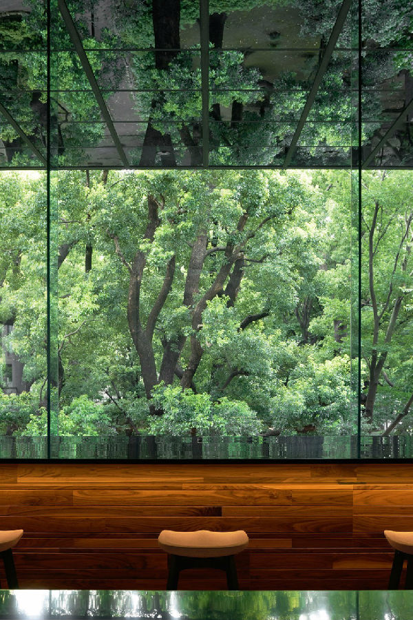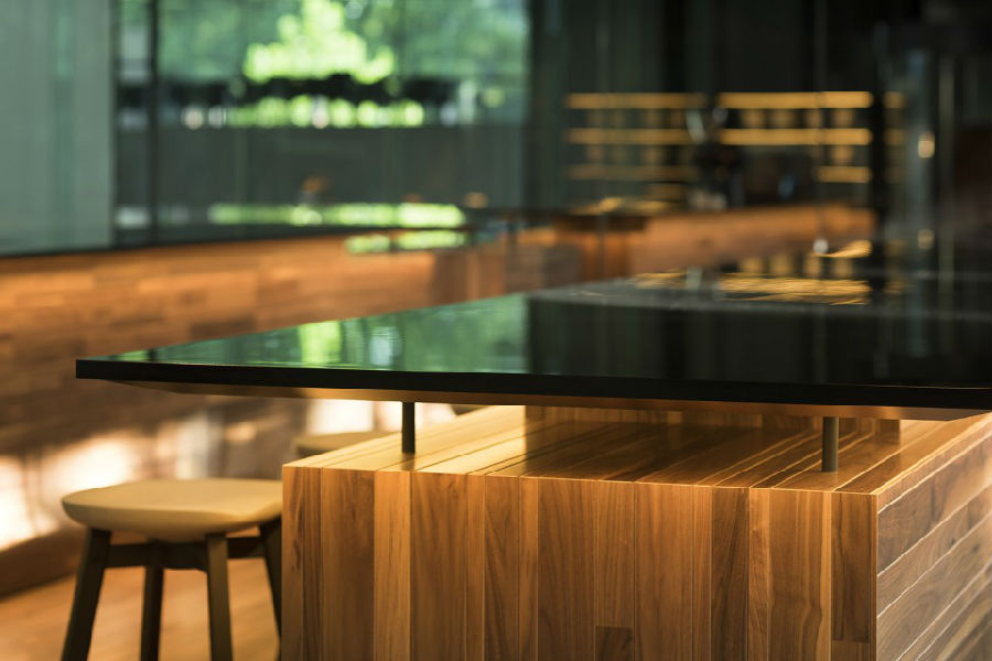 nendo希望将景色最大限度引入室内,他们大面积和多处采用到了镜面材料:天花板是灰色镜面,桌面采用相同的灰色镜面,柜台顶部采用黑色反光亮漆,大部分家具也采用黑色。