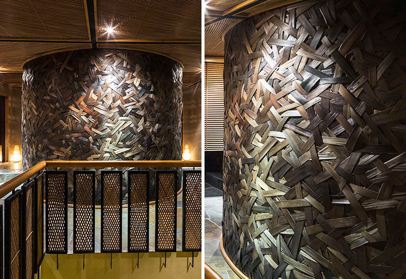 弧形的墙壁在空间中明显突出,有助于创造一个有趣的环境。晚上,当编织的竹墙被点亮时,它变得更像一件艺术品,而不是一堵墙。