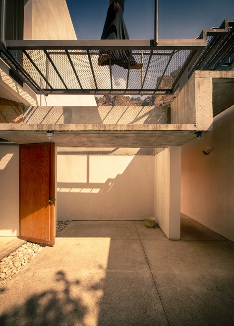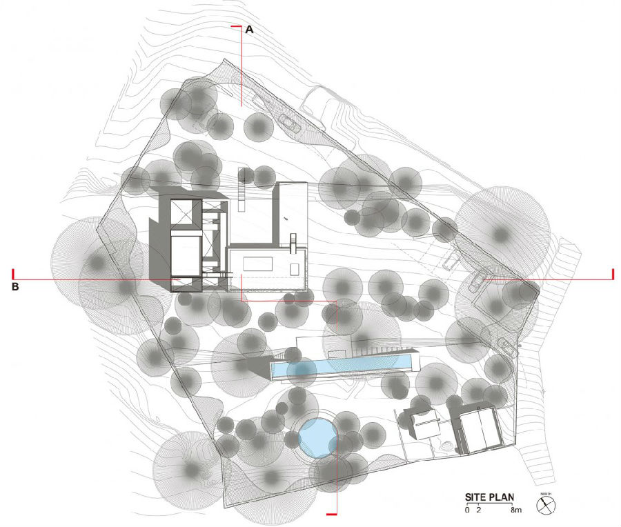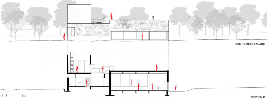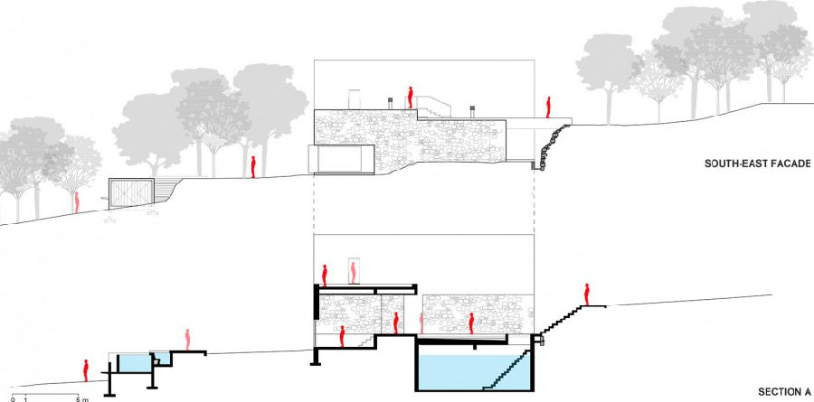 岩石砌成的房子低伏在树荫下覆满了植被的岩石坡地上。是自然环境里的一个纯净的空间。 内向的居住空间向外打开,与自然融为一体。只有偶尔出现,透过枝叶繁茂的树林的五颜六色的九重葛花,和树林上缘露出的巨大的白色盒子向外界透露着建筑的存在。