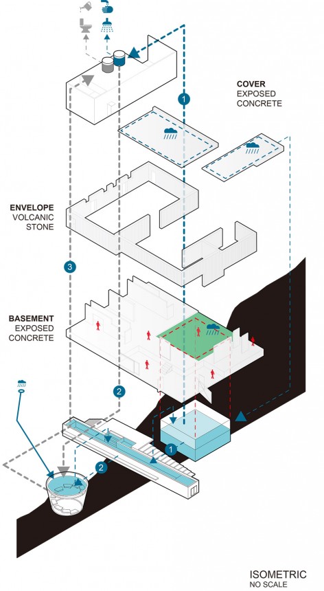 建筑采用了本地开采和加工的,最基础的矿物材料:地基、地窖和主要的结构由混凝土制成;火山石和水泥砖块砌起了墙体,再以白色的水泥和石灰混合物粉刷。同样的材料了也用于了粉刷室内的墙壁和天花;抛光混凝土地板平整耐用;所有的木质部件都以木油和打蜡收尾;可旋转的巨大幕门采用了钢制框架和钢化玻璃。