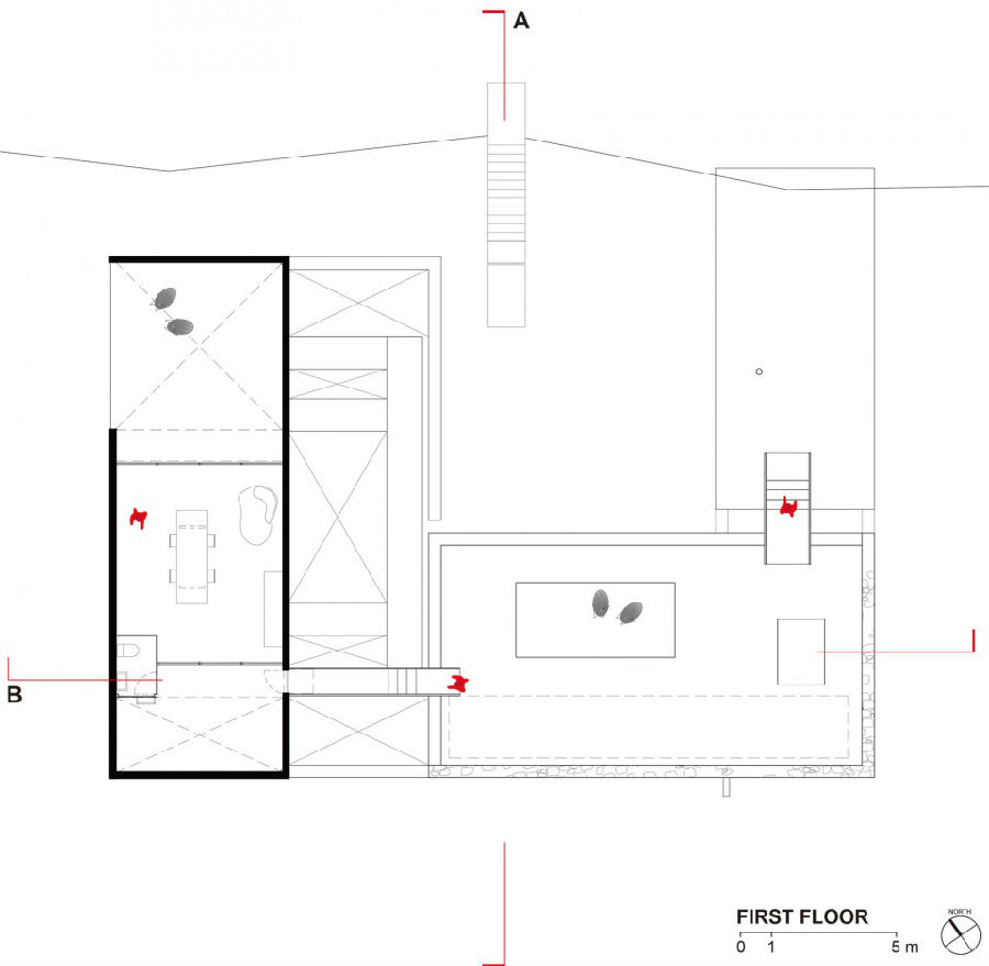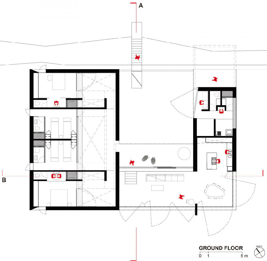 建筑空间被分为四个部分:公共部分包括了起居室和餐厅,一个开放式厨房,位于建筑中部,望向项目唯一人工草坪的门廊,以及覆盖了约280m3的饮用水源的楼板;后勤部分包括了一个烤架,厕所,浴室,洗衣房以及储藏空间;卧室部分分为两间主卧和两间客卧,除了共享的室外平台外,位于尽端的两间主卧还各自拥有一个私人平台;位于二楼的工作室则需要通过屋顶平台前往,其两侧各有一个室外平台。