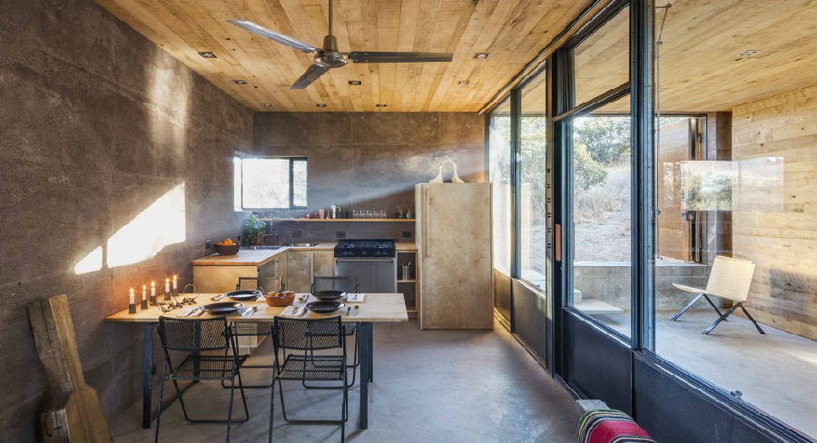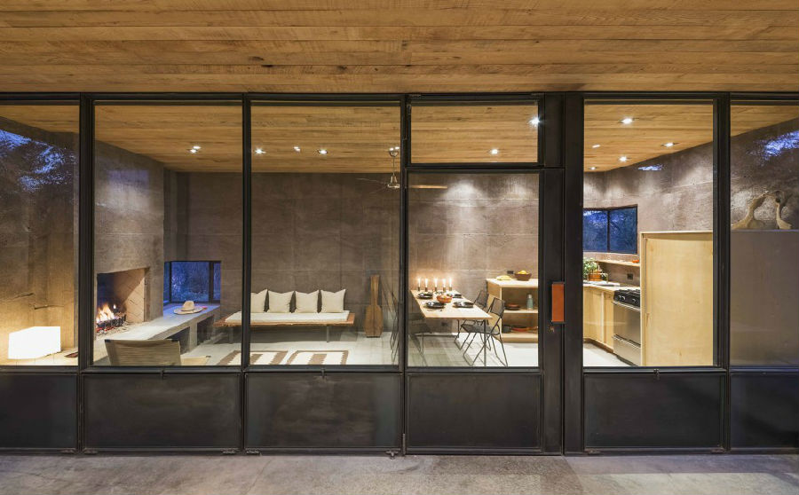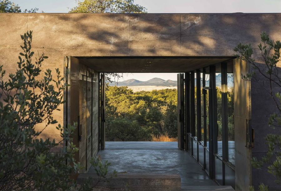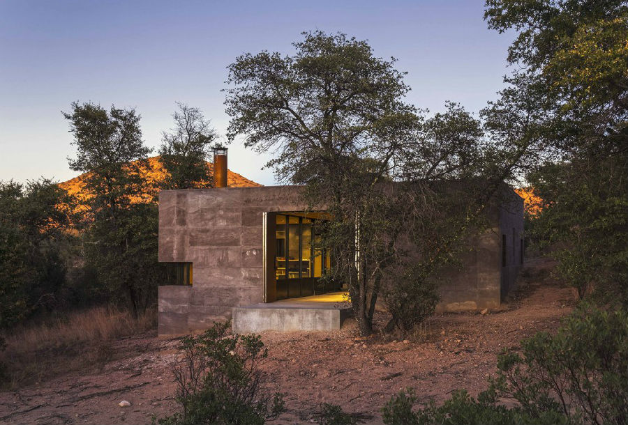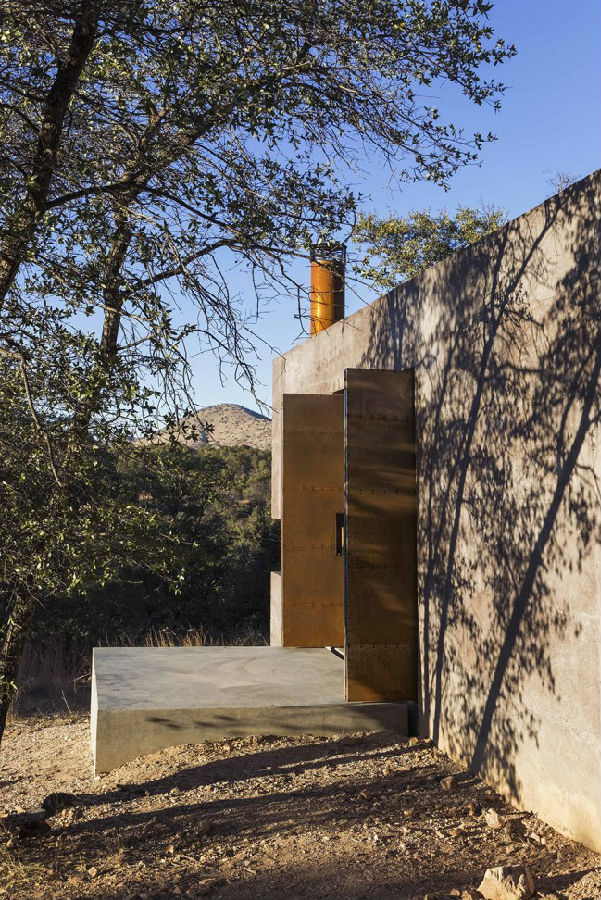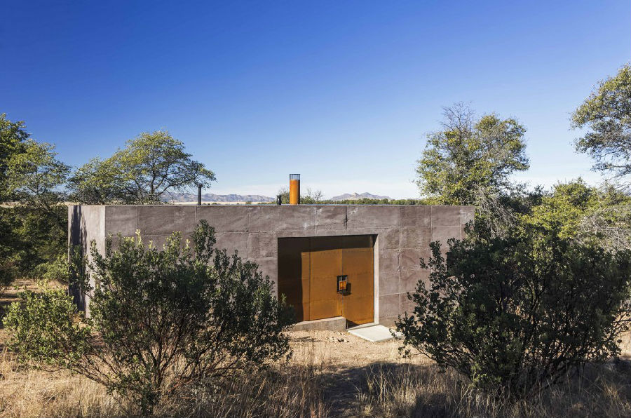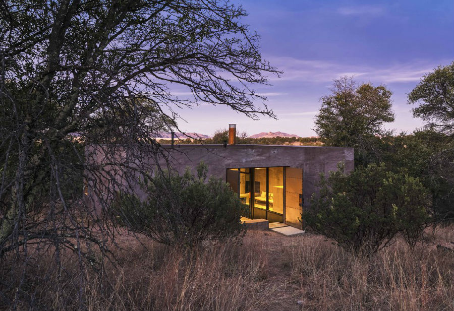 这栋约90平米大的小住宅坐落于亚利桑那州南部的San Rafael山谷内,距离最近的城市Tucson两小时车程,而向南15英里便是美墨的边境。居住者在远离喧嚣的同时也远离了便利的现代生活,所有能源必须自给自足。建筑的选址在风景与安全中找到了平衡, 既坐拥眺望远方开阔草原和延绵山脉的无敌视野,同时,大地色的建筑深藏在丛林之中,不易被狩猎者、探险家或潜在的移民所发现。而鉴于其临近边界,可步行到达的地理位置,业主对整体结构的稳固性也有了更高的要求。