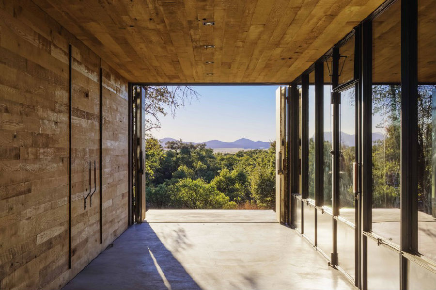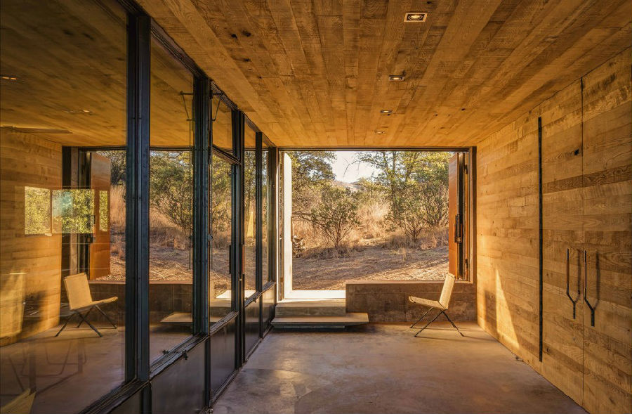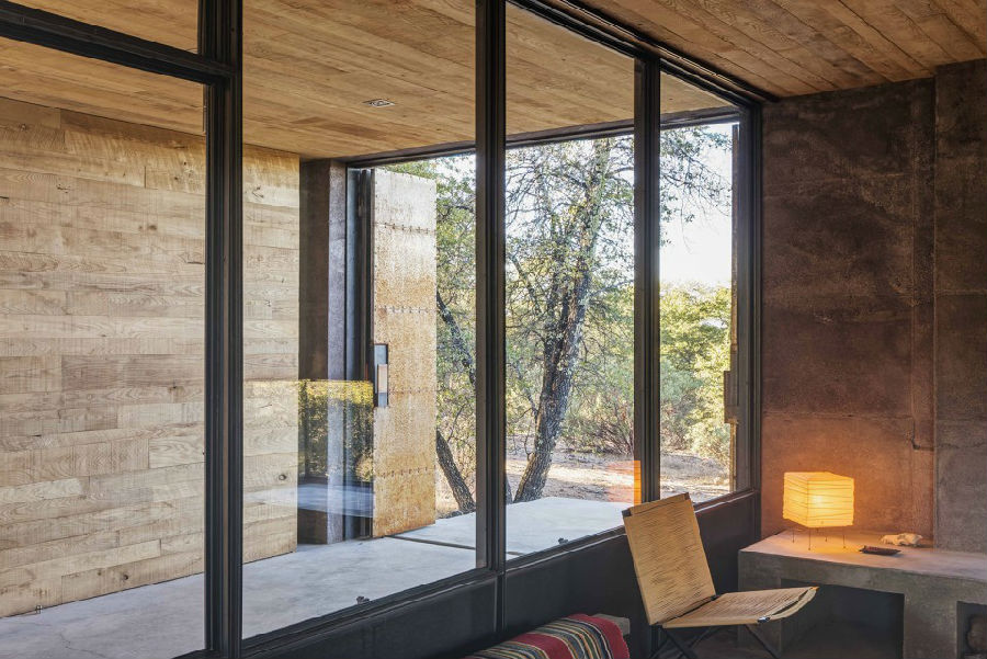 18英寸厚的浇筑岩墙壁厚重而低调,方形的体量完全融入了本土的橡树从中,俯瞰着山脚下广袤的冲积平原。这种当地常见的材料由轻质红色火山岩粉末,水泥和水混合、夯实而成。稳固的墙体支撑起整个建筑结构,敦厚的墙体保温隔热,维持着室内温度的稳定。