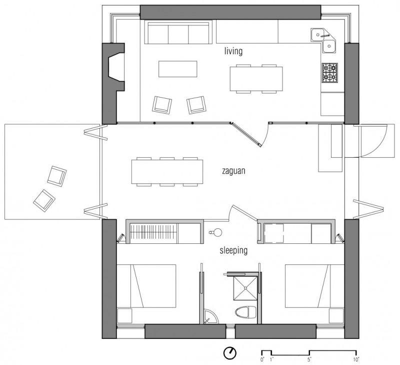 在夏季,微风吹过Zaguan,再通过巨大的落地玻璃门和墙上的小窗户穿过内部空间;而在冬季,附近的树木则成为了无限量的燃料库。清澈的水源来自深入地底的水井,而太阳能维持着必要电器以及夜间的少量照明。此外,在整个建造过程中仅产生了极少量的建筑废料。