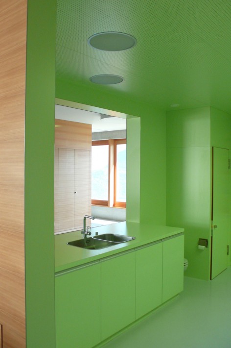 延续阿尔卑斯山地区的建筑传统,建筑内外都使用钢筋混凝土作为主要材料。立面上尺寸相似的开窗更加强调了与环境整体的统一性。室内装饰部分地使用木材,这也是此地的传统。多功能厅的内装整个使用叶松木,是建筑中最为华丽的地方。