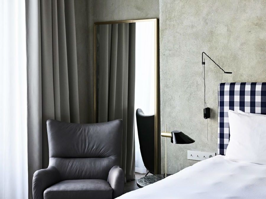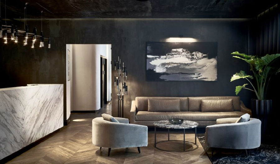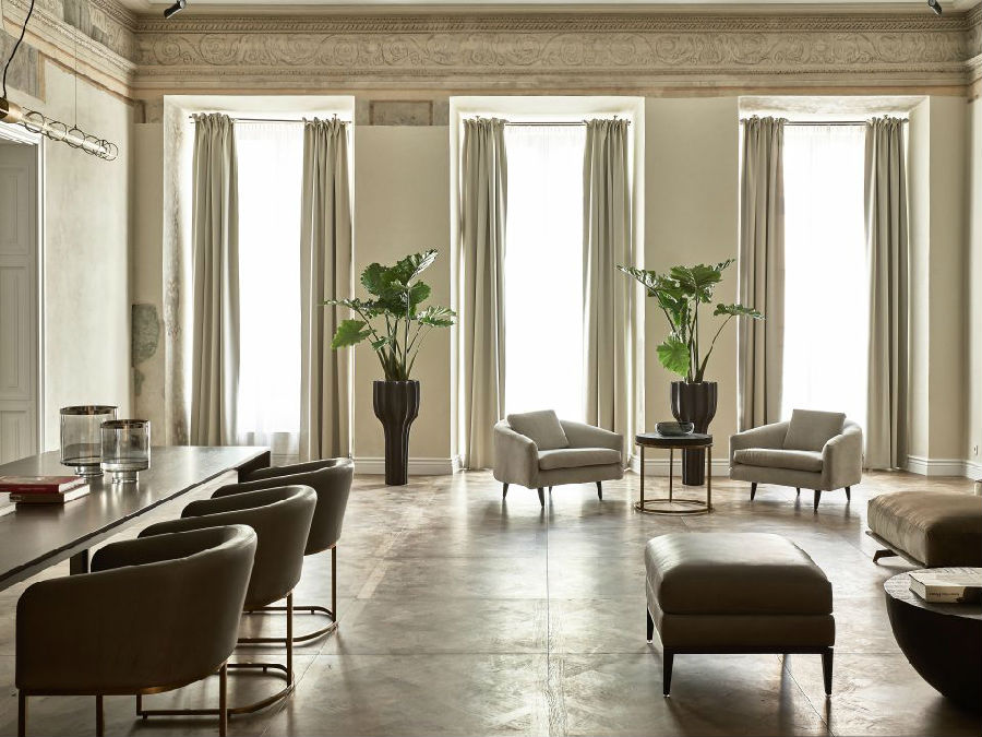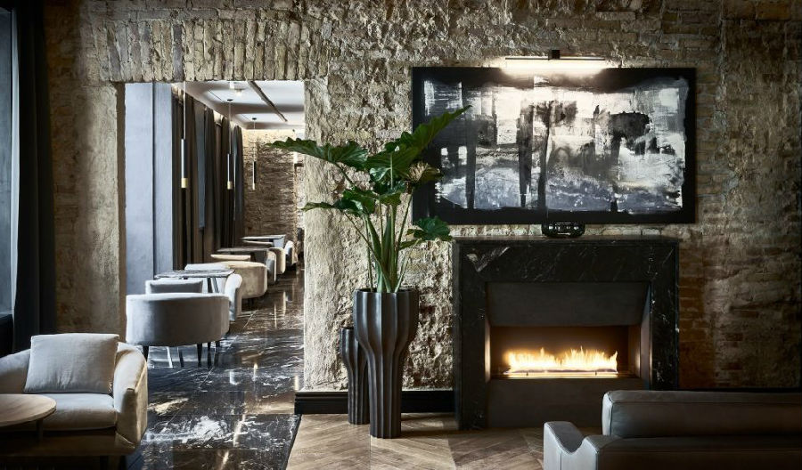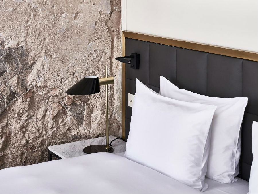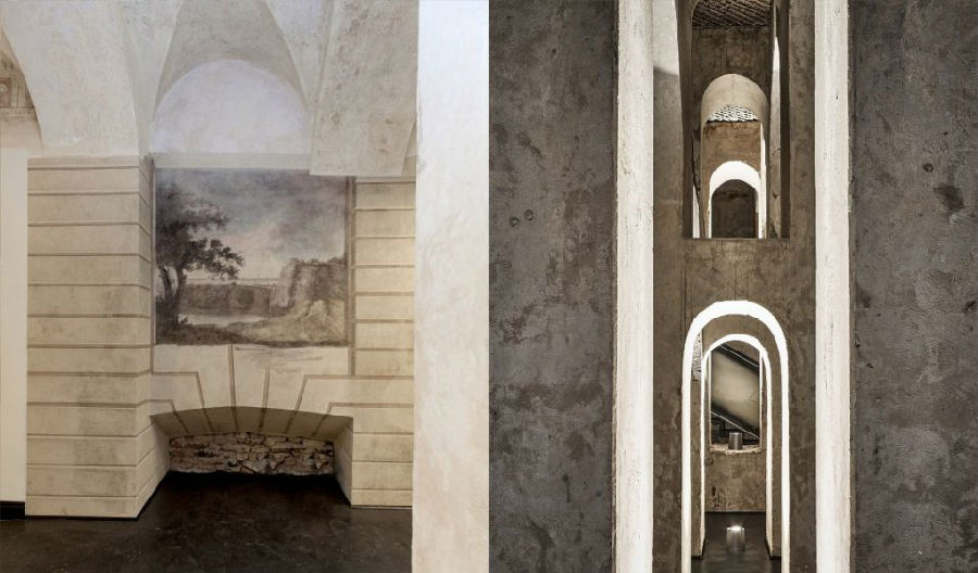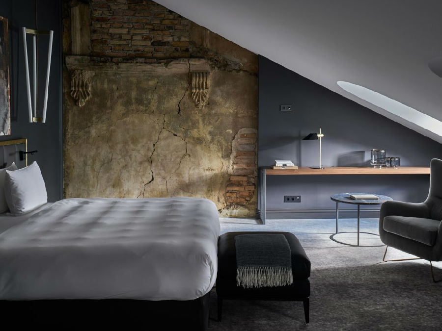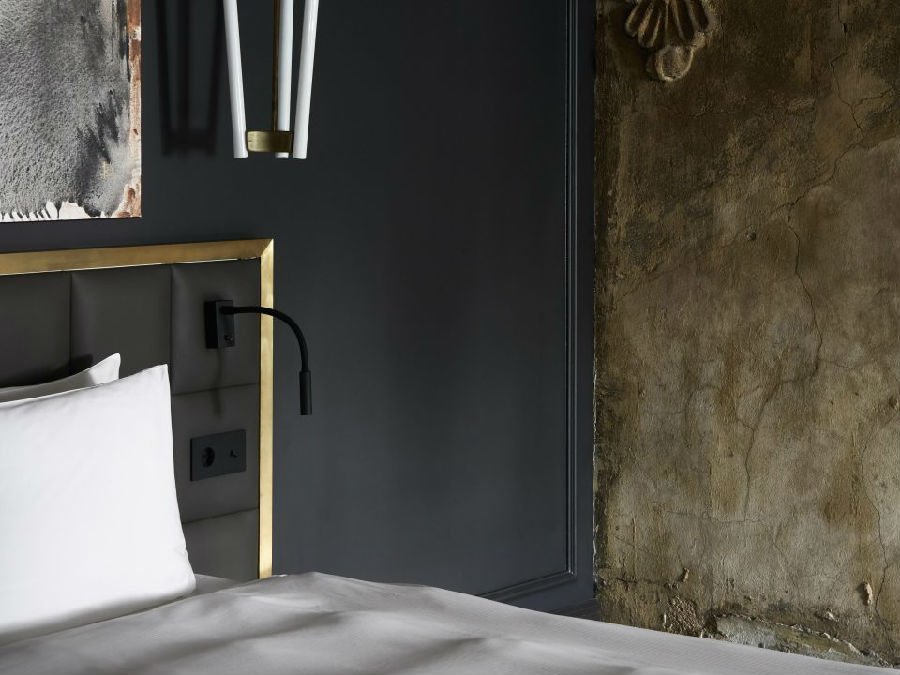 九十四间客房和十间套房的设计无不展现出设计师对各具特色的空间营造。从复杂精致的墙面细节,如手绘的柱列和粗糙裸露的砖墙,到保存完好的木梁天花板和壁画,无不在设计师的巧夺天工下展现出独特的风采。空间色调在蛋壳色、浅灰色、灰褐色和深棕色之间展开变化,丰富的色调让空间自然而然的与设计相结合。公共空间色调以深灰色和蓝色为主导,其中地板和楼梯材料来自于“Pandomo Loft”。