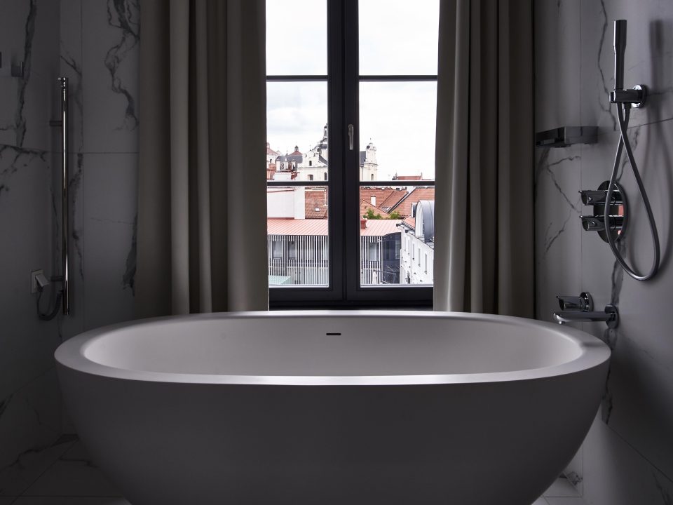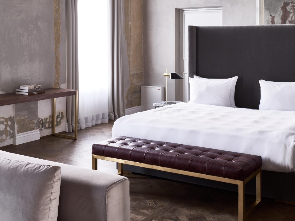 打造一种既符合建筑的文化真实性,又植根于这座魅力城市的酒店环境,意味着建筑的重修工程与保护措施同等重要。改造过程中,建筑师Saulius Mikštas尽力保留了原建筑的真实细节,包括庭院,拱券结构及遍布空间四周的壁画。建筑内的壁画及装饰大多源自巴洛克时期Pacai家族。设计师将这些穿梭时代的壁画一片片修复,与此同时,有更多的壁画被设计师移除,暴露出最内层的保存完好的墙面。该家族建筑历经异主之后部分房门被封死。设计师在此次重修工程中,将封闭的房门重新打开。一些保留的细节如充满神秘色彩的楼梯间,栩栩如生的雕塑,和丰富的历史古器,都被重新融入到建筑环境中。设计师在原建筑之上加建两层空间,并覆盖上全新的巴洛克式屋顶。