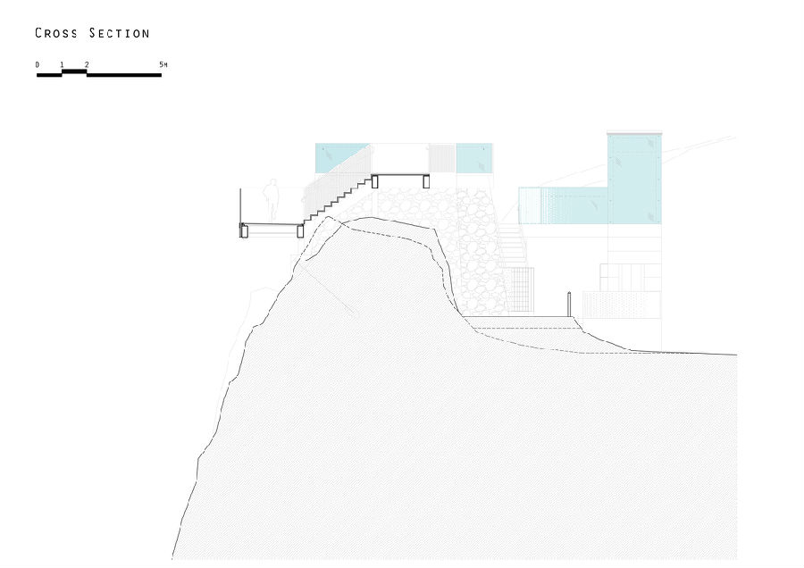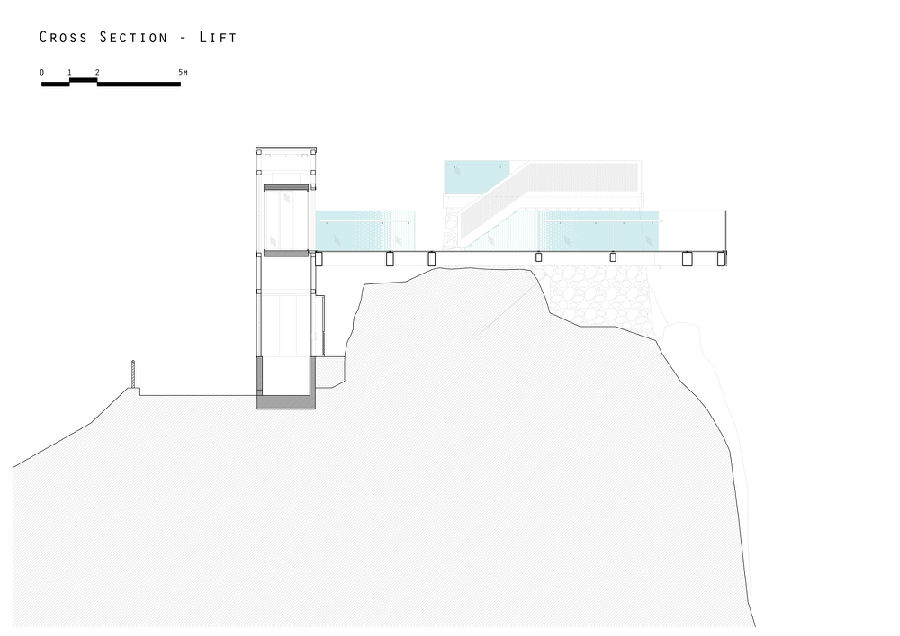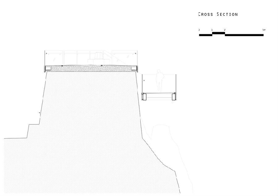 新增加的是一条2.5米宽的走道,悬挂在陡峭的地形上,全玻璃地板和栏杆最大限度地保证了所有方向的视野。该结构用70米的岩石锚固在岩石上,每个岩石锚具有15吨的拉伸载荷; 确保结构不仅可以承受上面的游客施加的负荷,而且还能承受在岩石脊上产生的超过150公里/小时的风速。全景电梯提供了从下面的道路进入到场地的垂直交通方式,也作为整体结构设计的组成部分,将整个悬臂结构稳固在整个地形之上。