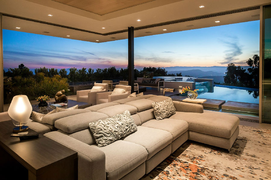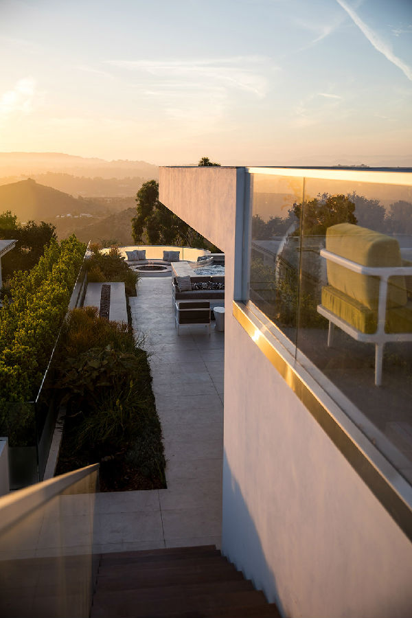房子的后方是以玻璃立面围合,为起居空间带来了朝向游泳池和远处比弗利山的全景视野,在打开窗户时则可以直接漫步至泳池和户外休闲区域。住宅整体以V字形向景观敞开,稍远一点的地方设有一个巨大的火坑和固定在场地中的环形座椅,可以在朋友们聚会时使用。