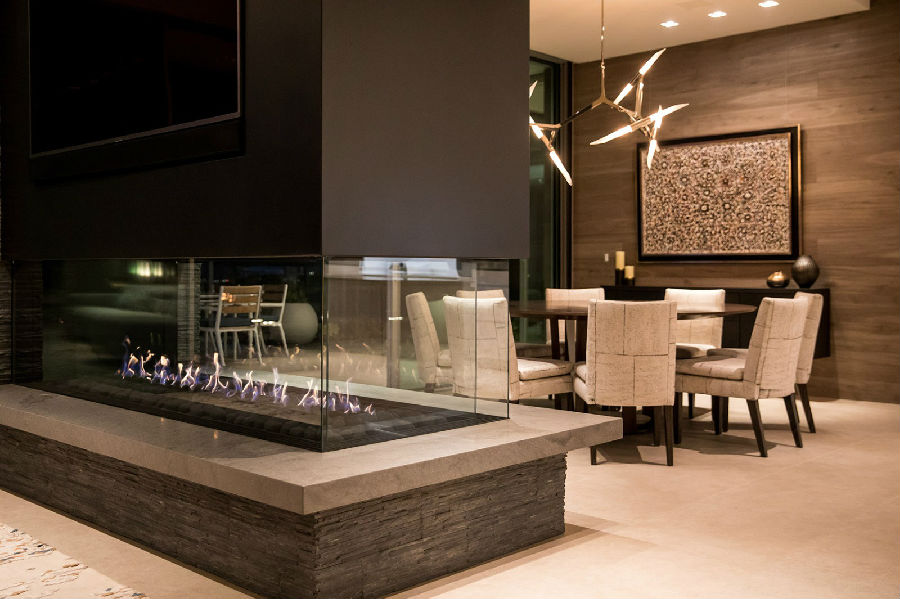 ▼ 客厅和餐厅通过一个三面的壁炉实现分隔