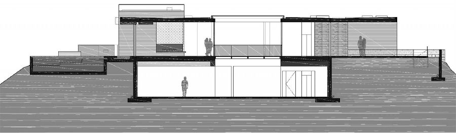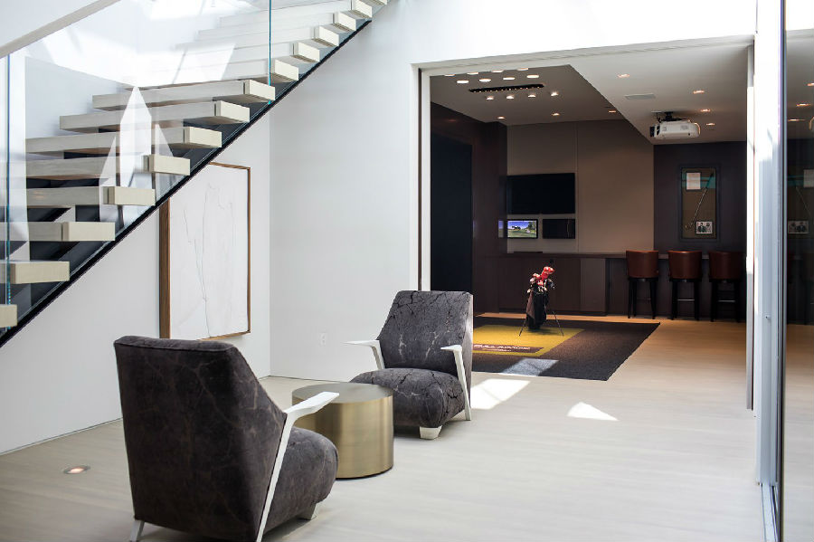 悬浮的楼梯通向最底部的楼层,或者你也可以乘坐门厅右侧的镜面不锈钢电梯到达这里。除了从视觉上连接空间,这一下沉的区域还需要满足各种功能。设计师希望业主能够提供一个他们需要的空间列表。最终这份列表包含了电梯、图书馆、办公室、家庭影院、健身房、沙龙、模拟高尔夫球场以及屋顶露台。一开始并没有一个能够满足所有这些需求并且能够符合建筑高度限制的方案。对此,设计师想到了使空间下沉的方案:降低后的图书馆使其上方的屋顶得以符合规范。客卧被设置在楼上,在保证私密性的同时也在下方形成了额外的车库空间。