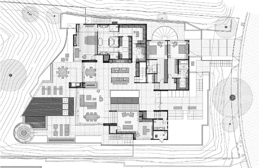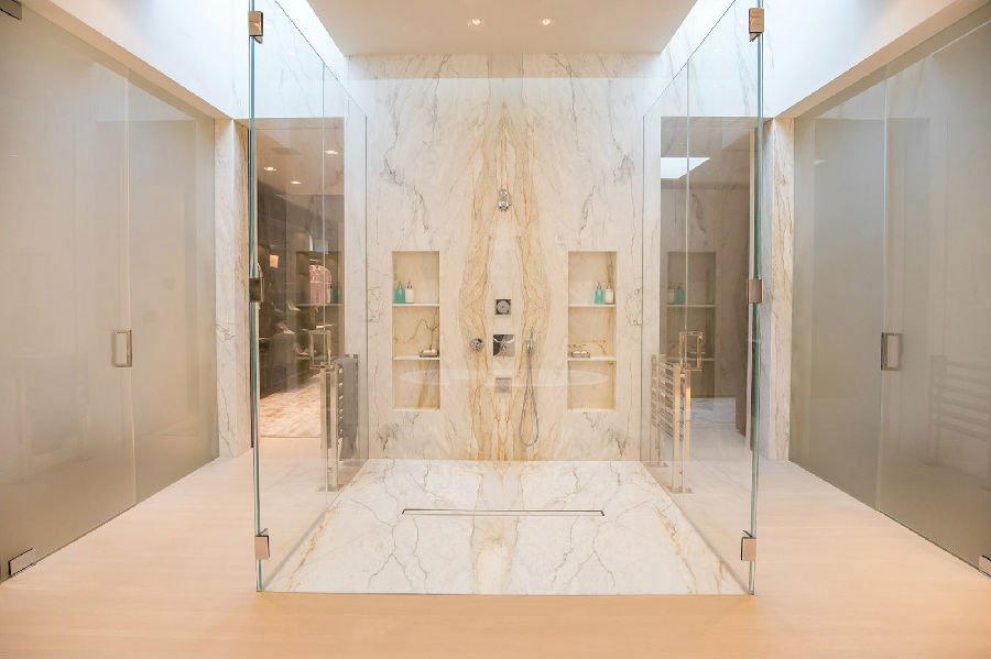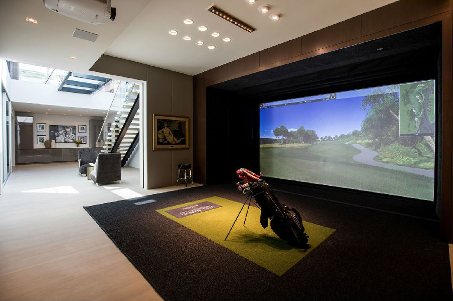 楼下的庭院通过天窗照亮,并配有休息室和藏酒室。周围的房间包括设施齐备的健身房和器械室、一间带有按摩床的沙龙、带有蒸汽淋浴间的浴室、模拟高尔夫球场以及一个铺设着Decorative Carpets地毯的家庭影院。这是一座高科技的住宅,家庭影院中不仅配有最先进的投影和音响设备,停车场内还设有一个转车台,可以识别每辆车并将其旋转到预设角度以方便驶出。