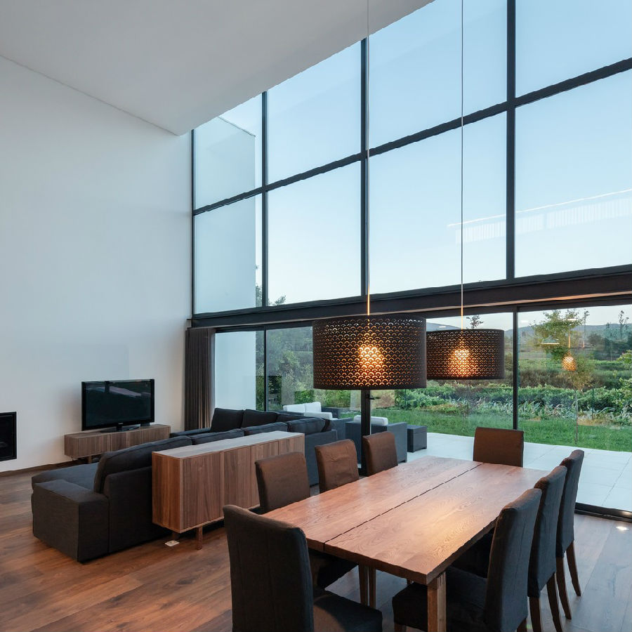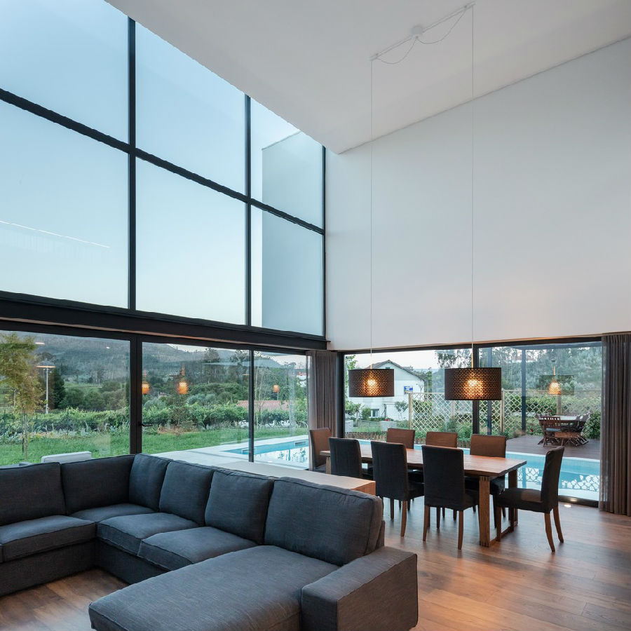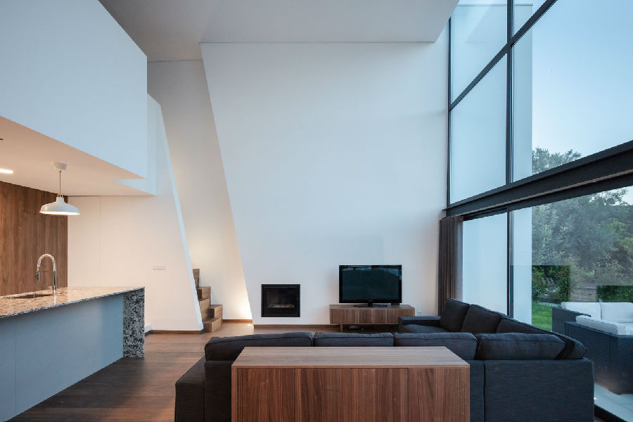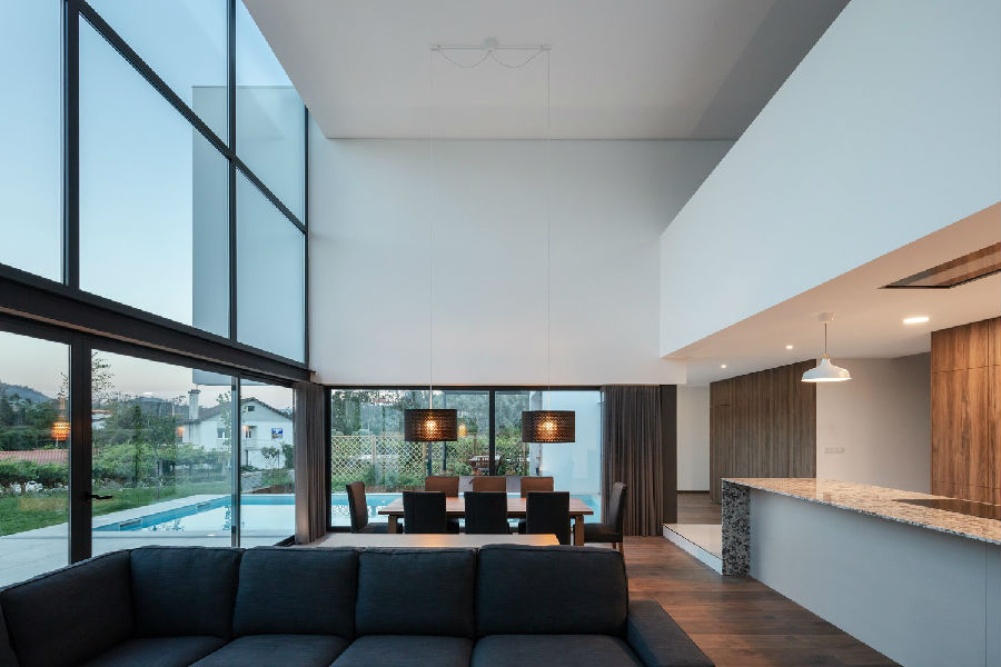 经过一定的体量压缩手法,我们将条件化的空间扩大到一个双倍通高的体量之中,容纳了房子的一定的社交功能区域,在同一个屋顶之下囊括了厨房空间,餐厅和起居室,它们被重新统一规划,在设计上采纳了该地区本土住宅的家庭布局方式风格。这是一个透明度很高的空间,通过宽大的玻璃墙与情节和米尼奥的广阔景色相关联。