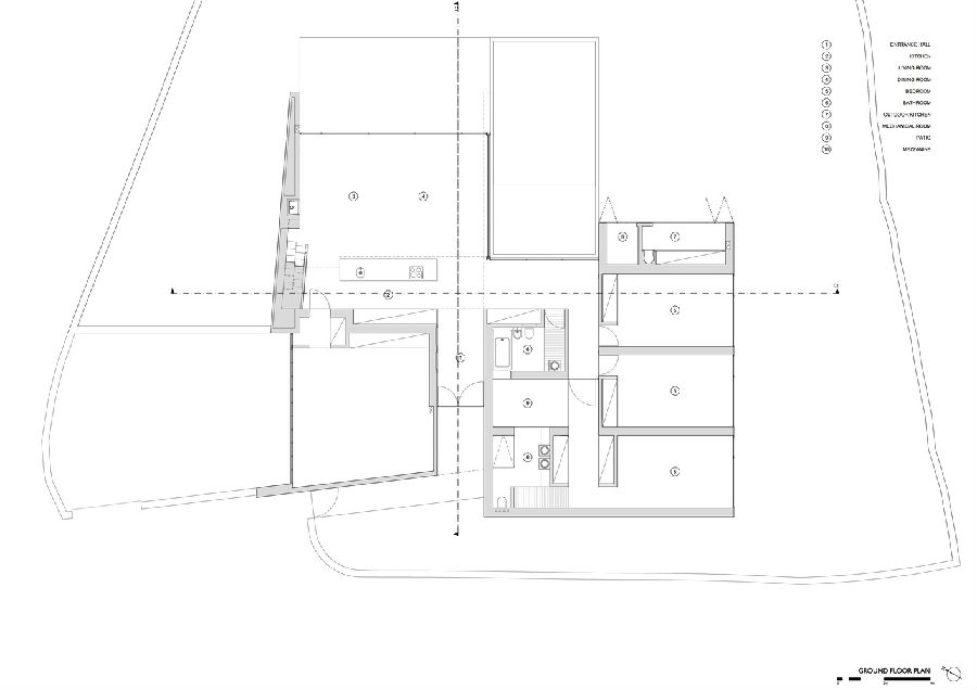 小型的内部庭院同时可被主卧室和浴室同时享用景观视野。庭院即是是一个功能空间,并且也允许创造出一个新的空间,虽然在房子内部,但确起着象征性地分隔作用。