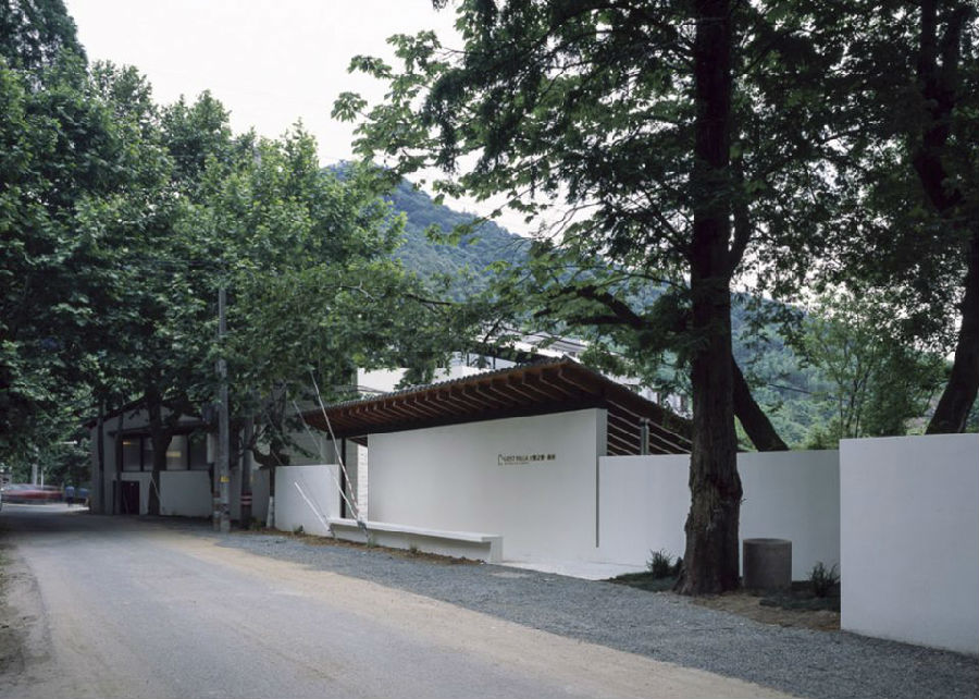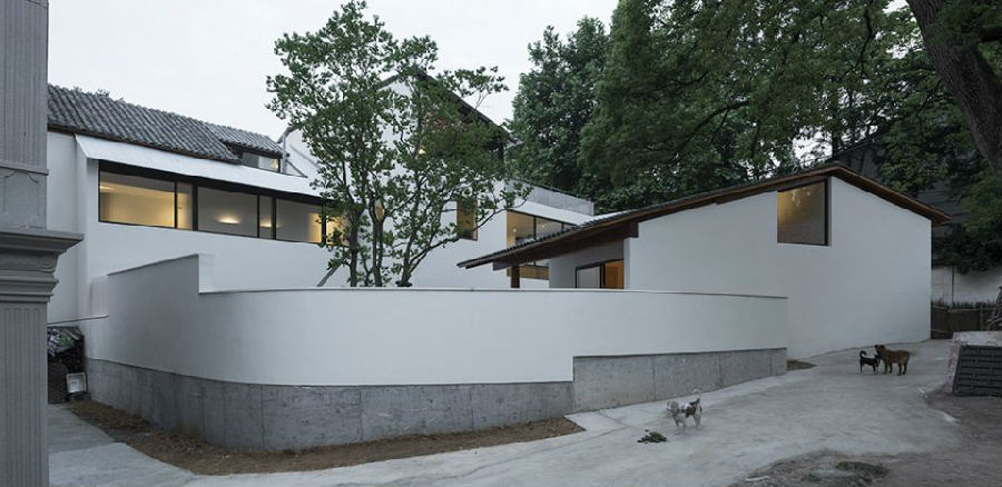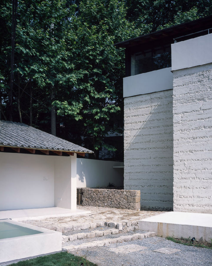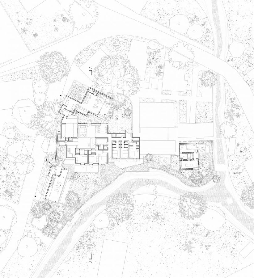 项目基地位于浙江莫干山镇庾村国营时期蚕种厂的西侧,顺着山路可上到莫干山顶。场地从西北角转入,由北向南逐渐跌落。北侧紧邻村舍,曲折退进;南侧沿小溪蜿蜒延展,视线开阔;历史遗留下来的用地权属界定了犬牙交错的边界。旧有的建筑散落在场地上,有些已破旧坍塌;对岸建设中的环山路以及废弃小学的未来状况亦难以估计; 树木填充了村落肌理的剩余空间。这是很日常的当代中国乡村的景观,是混杂的也是动态的。