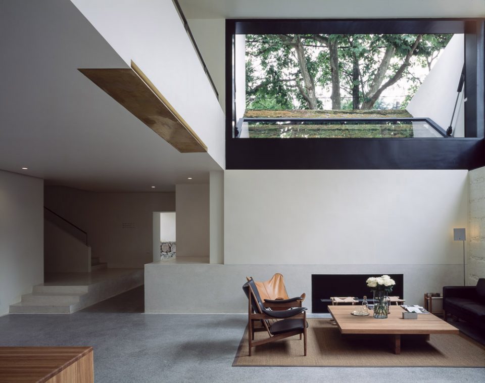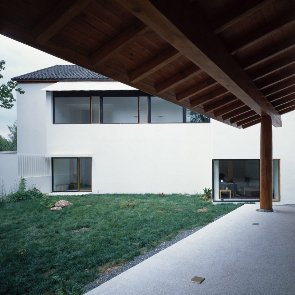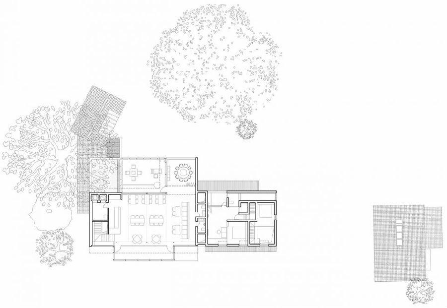 ▼ 餐厅全景式开洞,扁平屋顶与张拉索