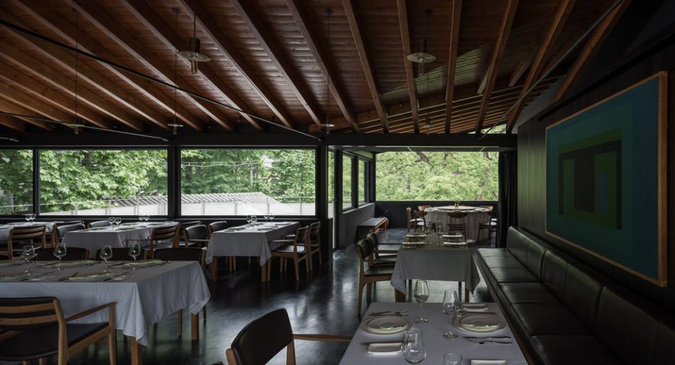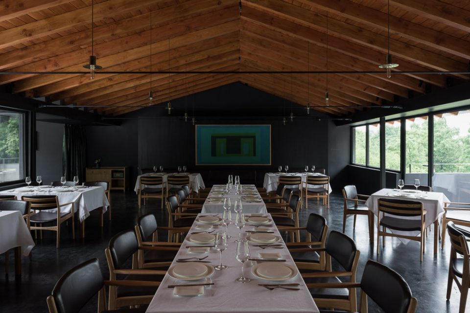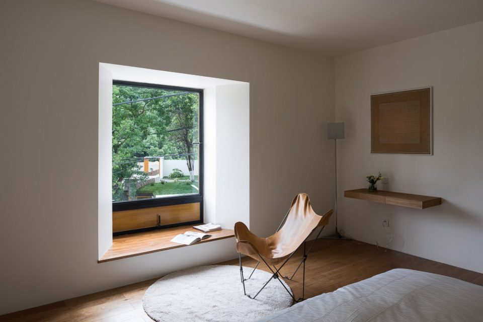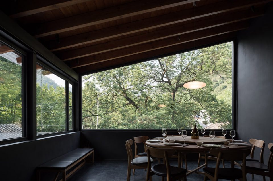 场地上的百年香樟和梧桐树,和远处的山景成为多角度反复借用的视觉对景。窗景的思考延伸到每个房间,取得了不同的客房平面和窗户视线的关系。设计抓住了布局与内部的拓扑关系,而在具体性放了一手,让策略性的思维超越了概念,最终呈现一种自然的姿态。