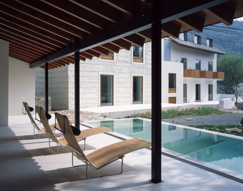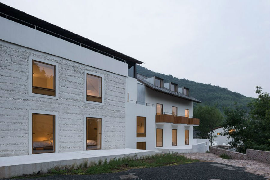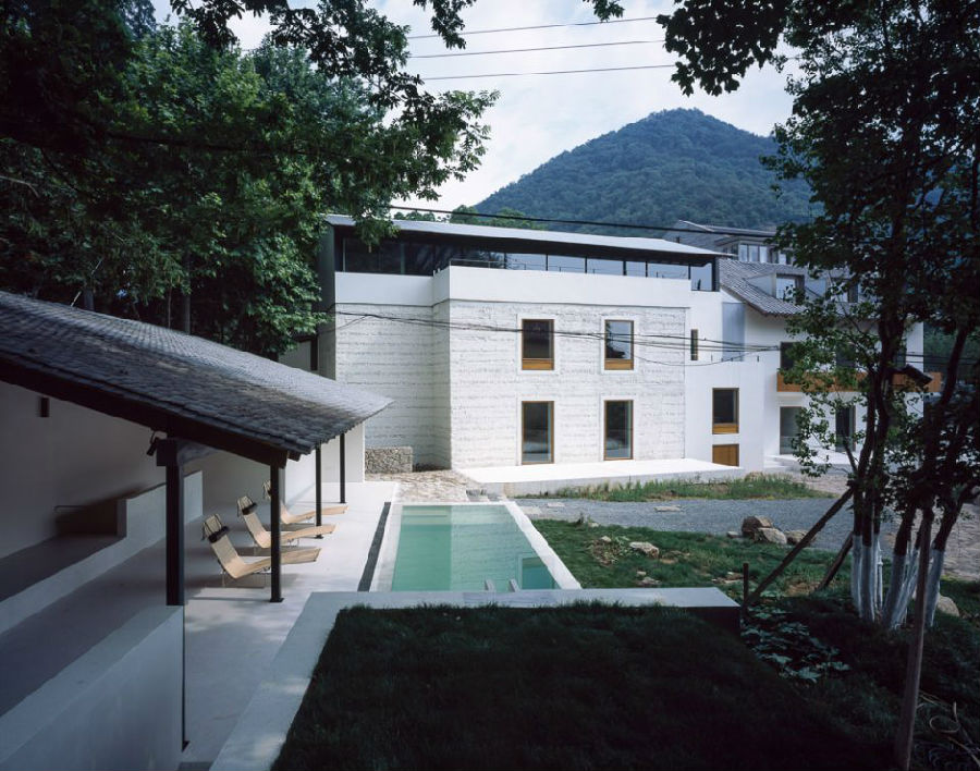 民宿的客房尽量都设置在中心体量的南侧以获得充足的日照和更延展的景观。西侧的凉廊和泳池区,既作为民宿入口的引导隔离开道路,也与中心体量围合成仅供内部使用的开放性庭院。最东侧的体量相对独立隐蔽,作为家庭化使用的独栋是最为合适的。