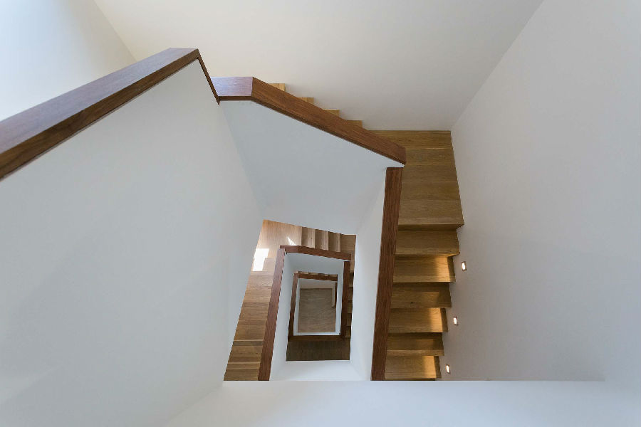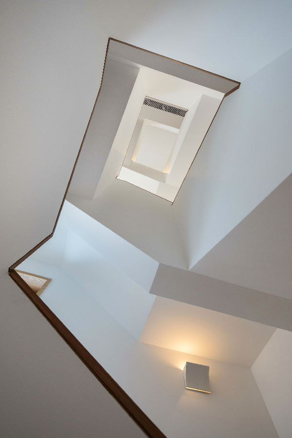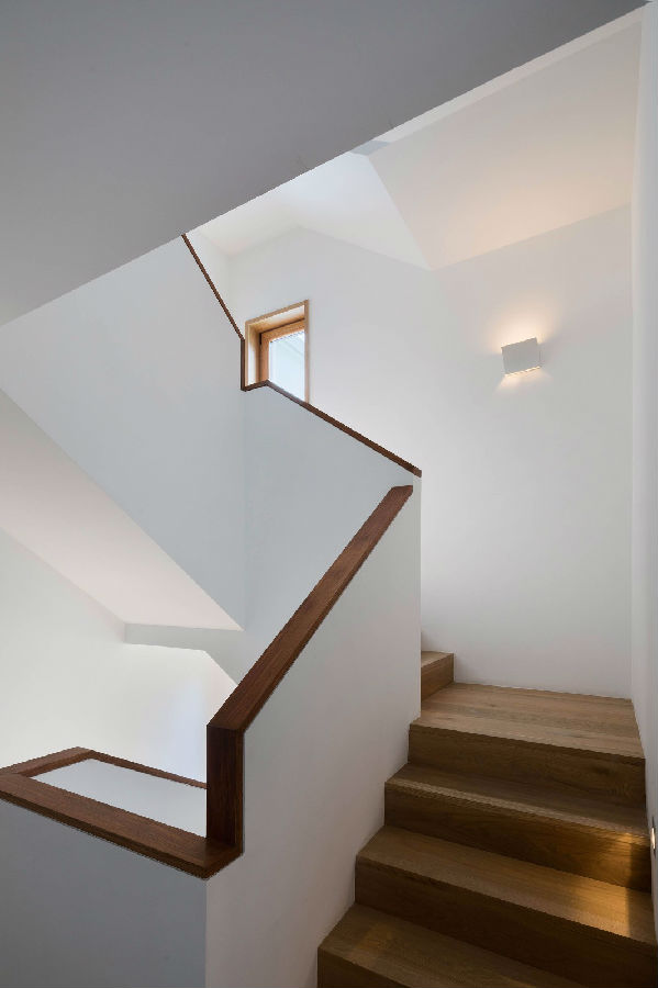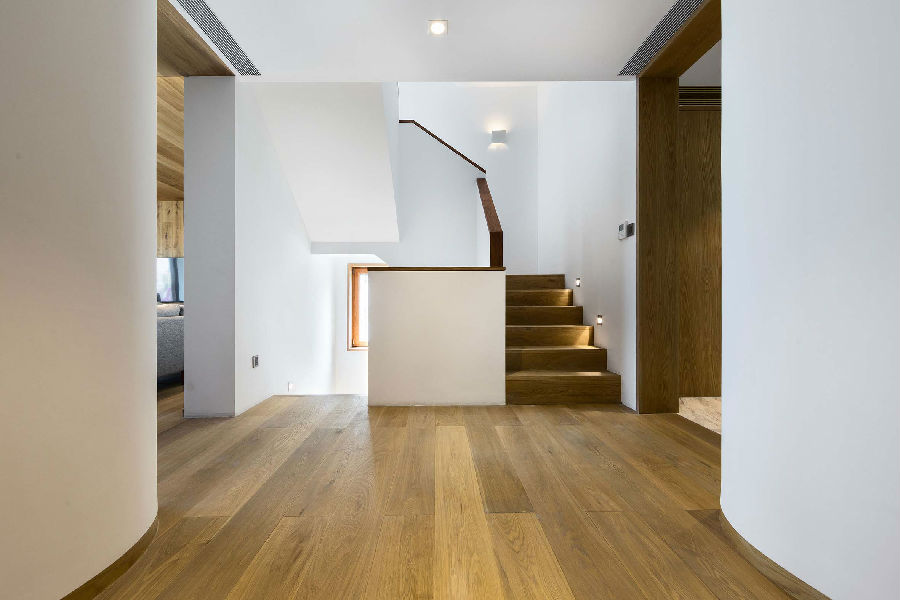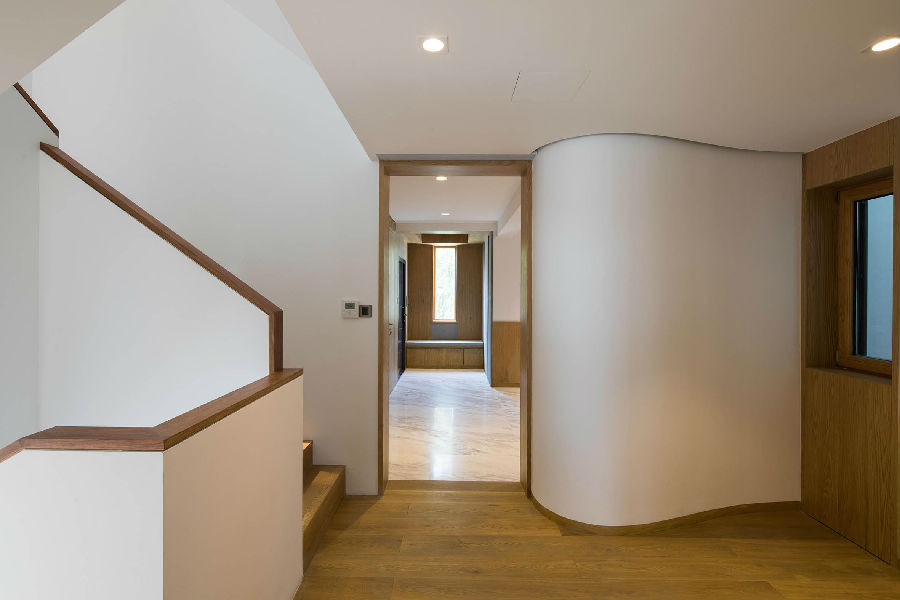 楼梯间以及原始中庭经过重新规划。考虑未来的行动方便增加了一台家用电梯, 楼梯踏步放宽并且以白墙/木扶手的线性转折发展出雕塑性的垂直空间。电梯厅两侧经过圆弧形的隔墙修饰原有立柱,将住房中心区块塑造成个性的枢纽。