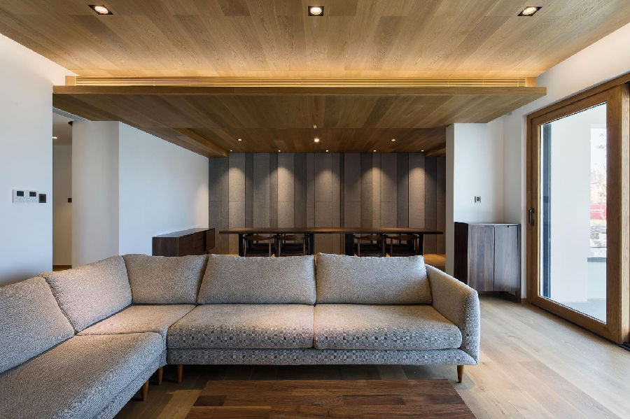 室内空间格局构成地上三层地下一层的别墅, 自然采光以及通风条件均良好。设计强调以自然材质的搭配营造空间的舒适性。内装材质的运用强调居家空间的整体性, 以简约的白墙以及橡木地板为基调, 贯穿各楼层并且延续运用在大部分的生活空间。 另局部搭配橡木木饰面, 粗面天然花岗岩以及大理石雕琢演变赋予个别空间一些个性的表现。