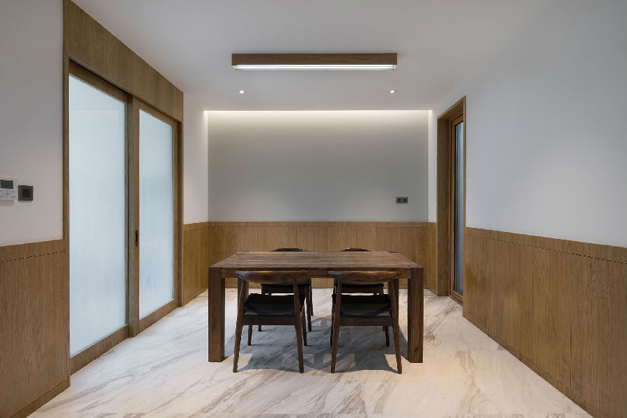 一层北侧的餐厅-厨房区块定义为私家用的小型聚会空间。 在此材料进行转换。 白色基调转换为地面应用的大理石,天然木材元素转换至墙面,体现私密空间的性质转换。大理石延伸至卫生间的材料语汇。