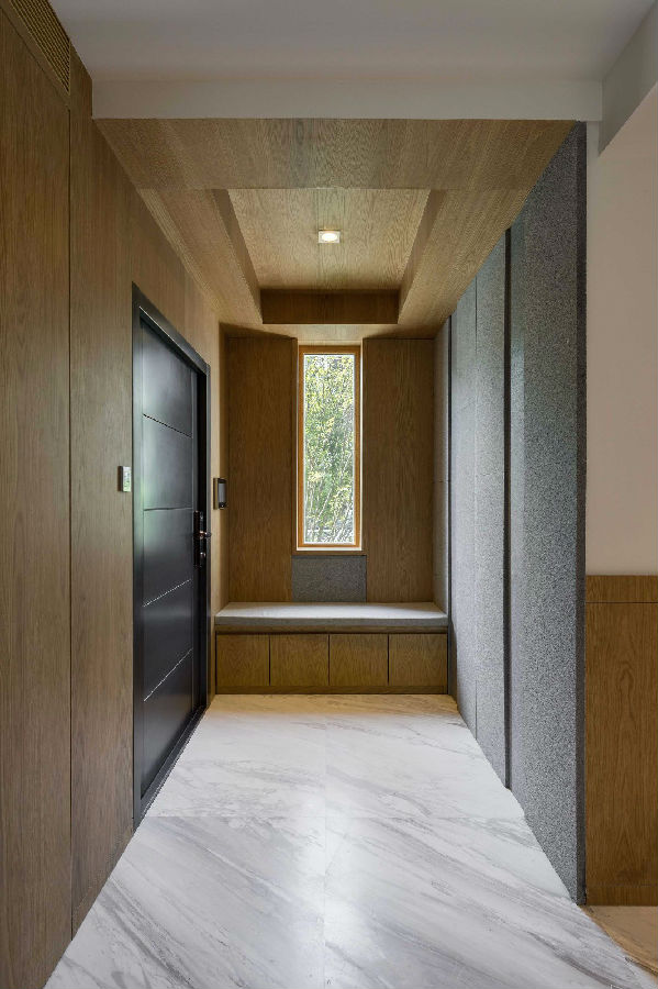 餐厅/厨房一侧是由橡木材质定义的后玄关空间,单扇窗透视至户外的绿意。