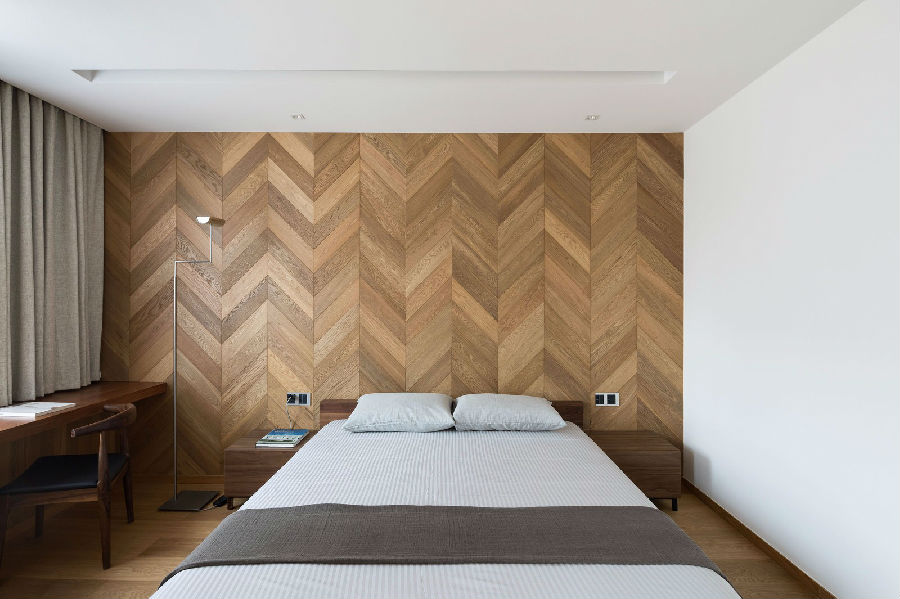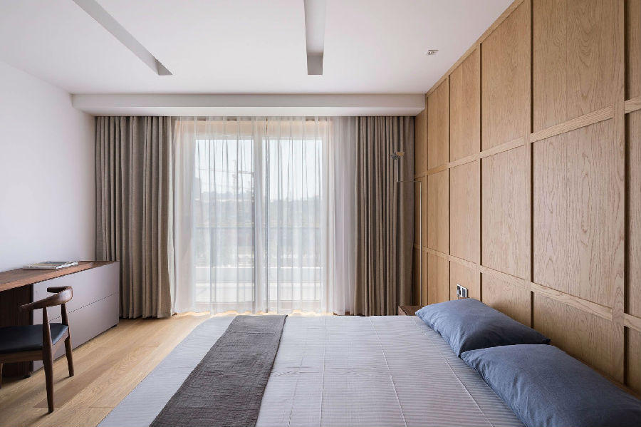 别墅二层包含了两个儿童以及访客用套房, 格局方正并且均有良好的对外阳台。顶楼三层格局重新组合后定义为主人起居楼层, 包含主卧室, 主卫浴,书房以及阳光房。 一贯的简约白墙与朴实橡木地板作为空间基调。但个别的顶部形态以及木饰背墙组合则诉说着不同使用者的个性。
