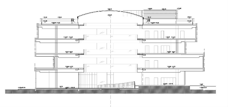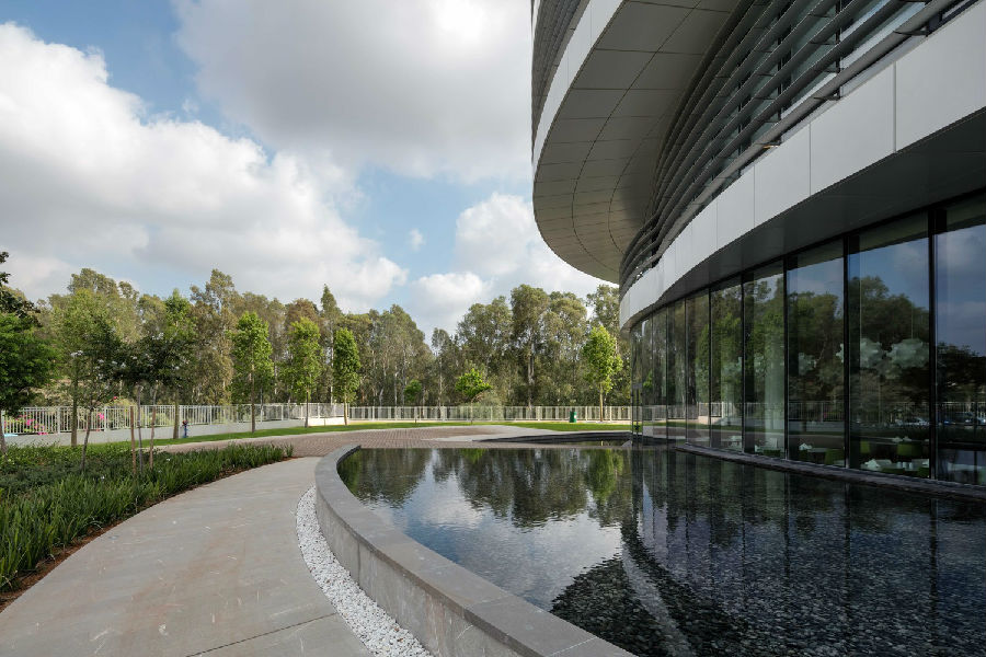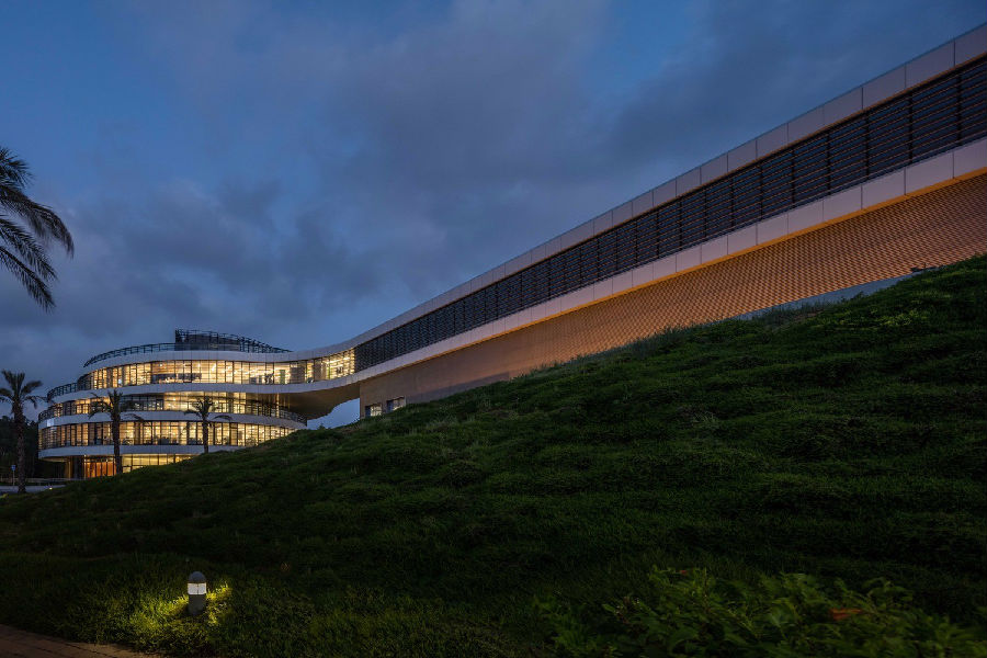 Delta Galil办公综合体的建筑面积达2万平方米。这座建筑好像一个个错落堆叠的布卷轴,其中有一个体量展开与物流仓库相连。建筑顶部设置有一个几何形状的穹顶,令自然光线倾泻而下,照亮所有的办公楼层并在纵向将整个结构连接起来。