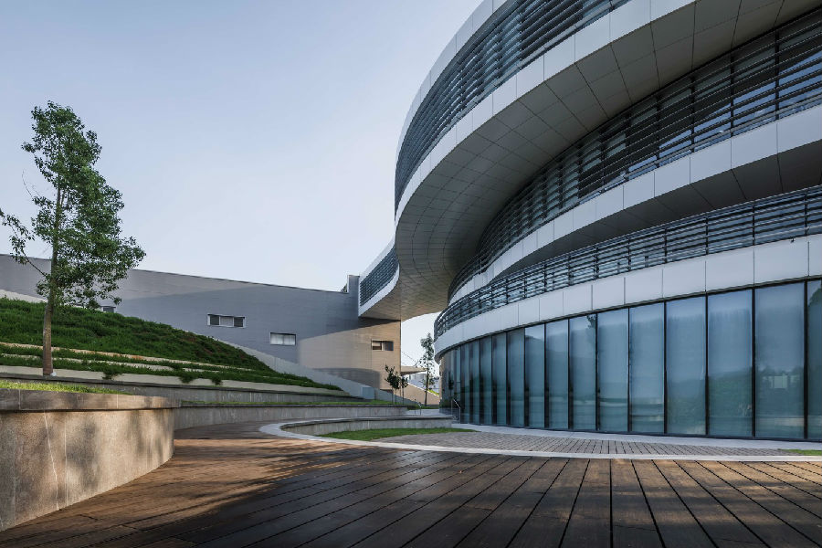 建筑上层的一个“布卷”体量设计成展开的形式,构成一座浮桥,直通物流仓库,该体量的外立面材料是波纹金属板。仓库里有成千上万的装货箱,通过复杂的货架系统进行归纳摆放。桥下的小路环绕着建筑设置,形成绿意满满的台地景观和小池塘,直接为首层平面中的职工餐厅带来自然风景。