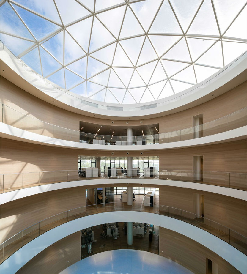 办公室以圆形的平面沿着大玻璃窗排布。每层楼都有厨房和阳台。不同朝向的阳台以及不同的楼层上可以看到不同的景观,分别能够俯瞰工业区,远眺大海和小树林。建筑中的遮阳设施通过两种方式进行设计:一种是重叠的楼板,另一种是椭圆形不遮挡视线的百叶。