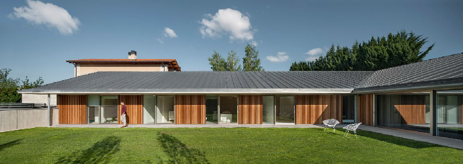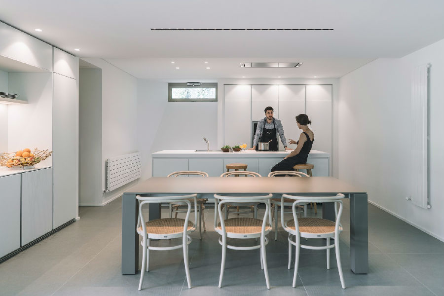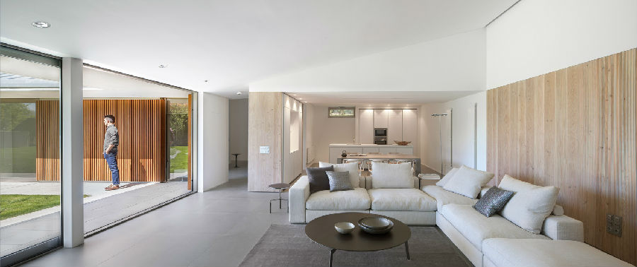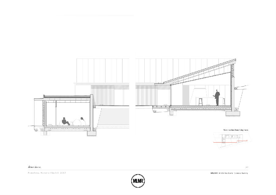 客厅大概是这个项目的亮点。它位于“L”型墙壁的尽端处,是住宅中最大的室内空间和内外结合区域。大尺寸的玻璃滑动门和锌板屋顶围合出来的门廊使这处空间的日常活动成为花园本身的延续体。客厅的旁边是厨房,背后是丹麦松木的软木板构成的墙壁饰面,其前方是低矮的门廊(仅有2.36米高)和倾斜的天花板,外部是花园和远处的潘普洛纳山景。项目所用材料所带来的隔离性、私密性和自然性也是本次住宅项目的特点。