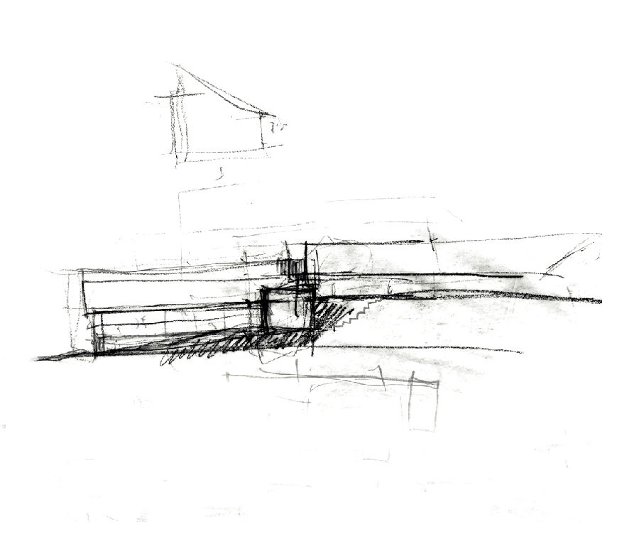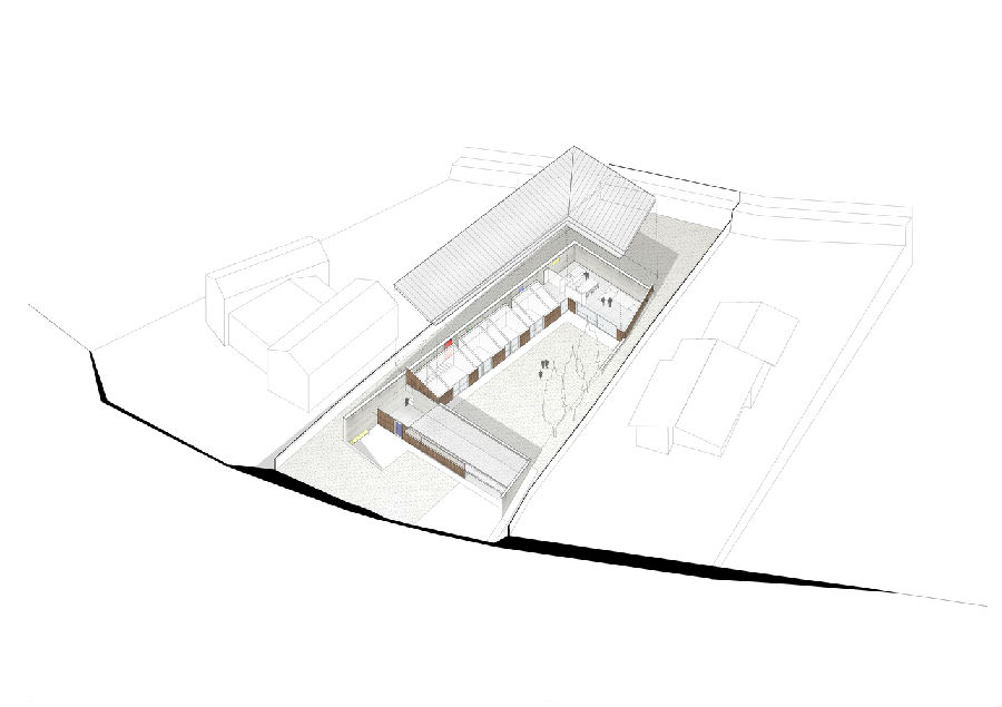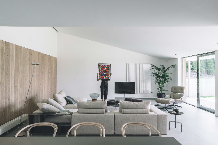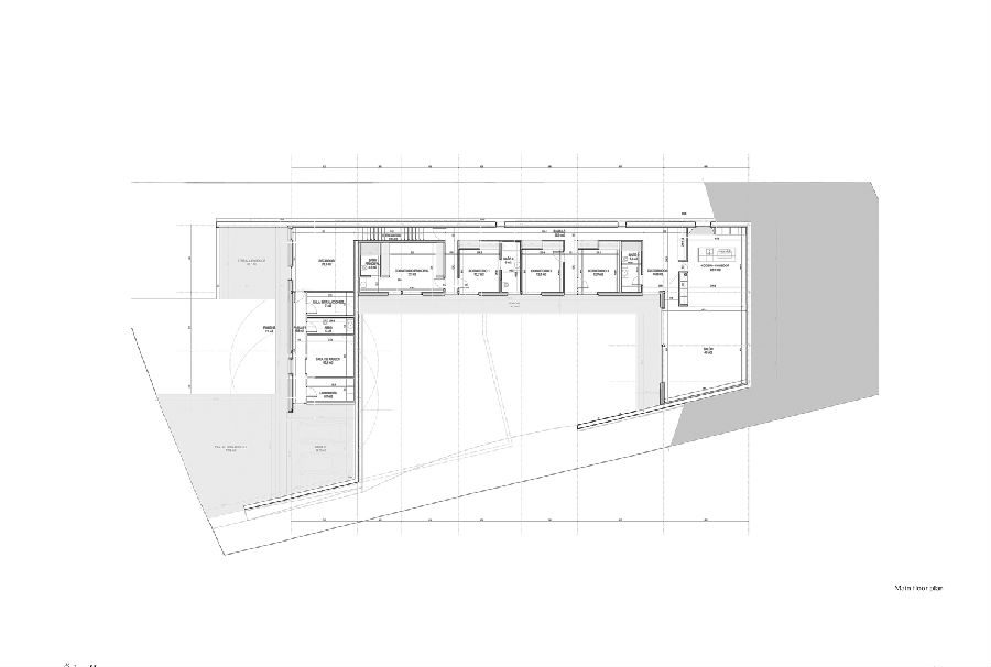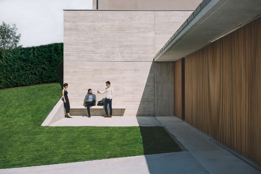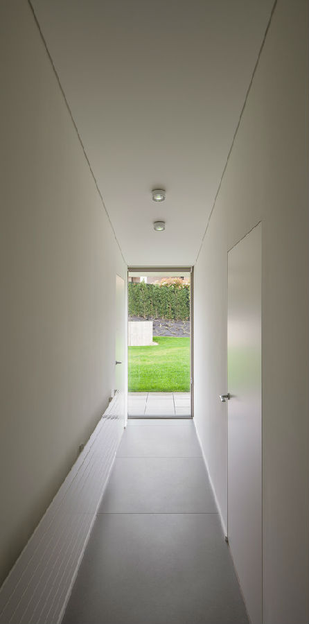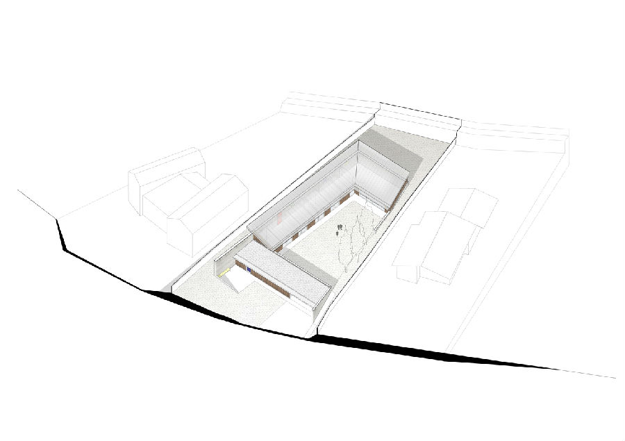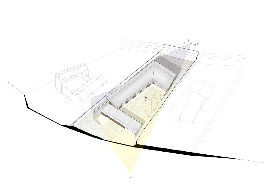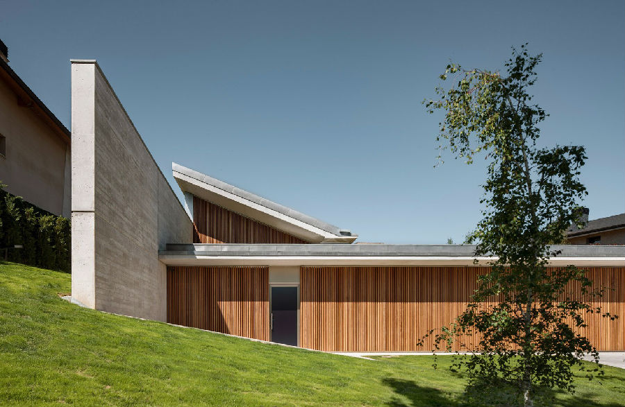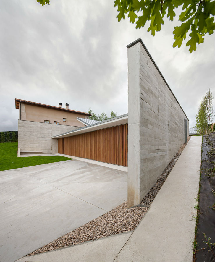 一道坚固的混凝土墙成为展现整座项目的关键元素所在。这道墙在某些区域相当高,在某些区域又半埋于地下,属于住宅的一道保护机制:一方面,它保护住宅避开北侧和西侧等不利朝向条件;另一方面,它保护房子免受周边地块视线的干扰。除此之外,它也是一种对土地的调控措施,能够帮助住宅形成平坦的空间并与地块较大的高差相适应。