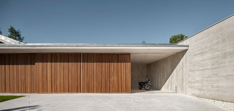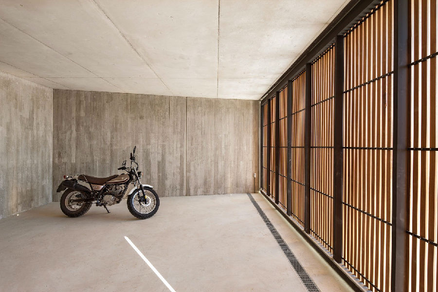 第二道“L”型的墙体形成了一个较矮的体量,里面设置有门厅,设备用房和车库。这部分体量也是一道“防守性元素”:其正立面较为抽象,由伊洛可木构成,可以阻挡看向室内的外部视线;其后立面便是上述提到的“L”型墙,是花园的侧挡墙。这部分空间对入口区域形成遮挡和限定,引导室内的人们看向远处的风景。