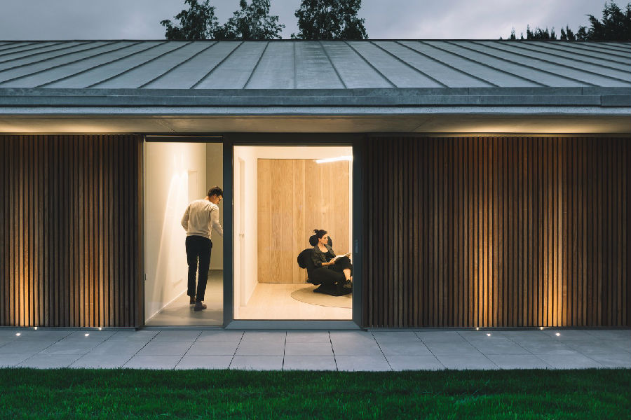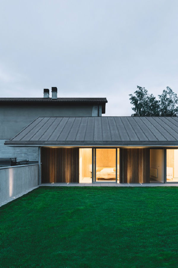 墙体呈现出一种清晰的“L”型,其作用也非常明显:住宅能够完全向私人花园打开,面朝东侧和南侧开窗。朝向花园的立面看起来柔和而温暖,采用伊罗科木制成的竖板和大玻璃面的条形窗构成。卧室布置在较长的体量内而客厅则设置在较短的体量内。相比之下,北立面和西立面略显粗糙,它们是墙的领域,而“L”型的背面则由混凝土和锌板构成。光线只能从某些特定位置上的彩色孔内穿入。