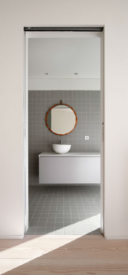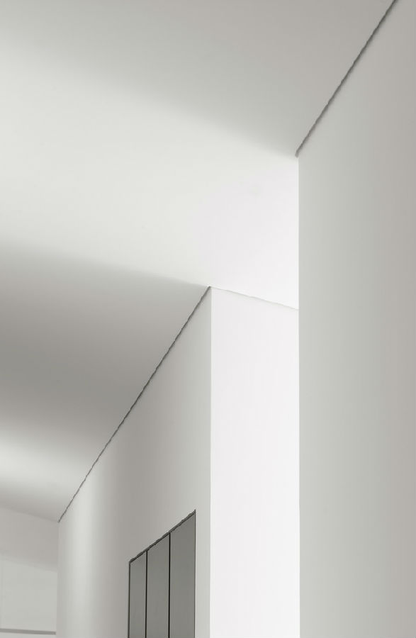与外立面相反,室内装修材料都经过了精心的处理。外部纯天然的材料与内部光滑而洁白的分隔墙和吊顶形成鲜明对比。当然有些材料也隐约显出了与外表面相似的“真实感”:例如卧室的地板和某些垂直的幕墙是用丹麦的天然松木作为饰面的;还有柱子,虽然它们被刷成了白色,但是从内部可以显露出原本的材质。简言之,室内空间是一个更抽象的环境,以倾斜的天花板和隔板为主导元素,其间穿插有柔和的光束。