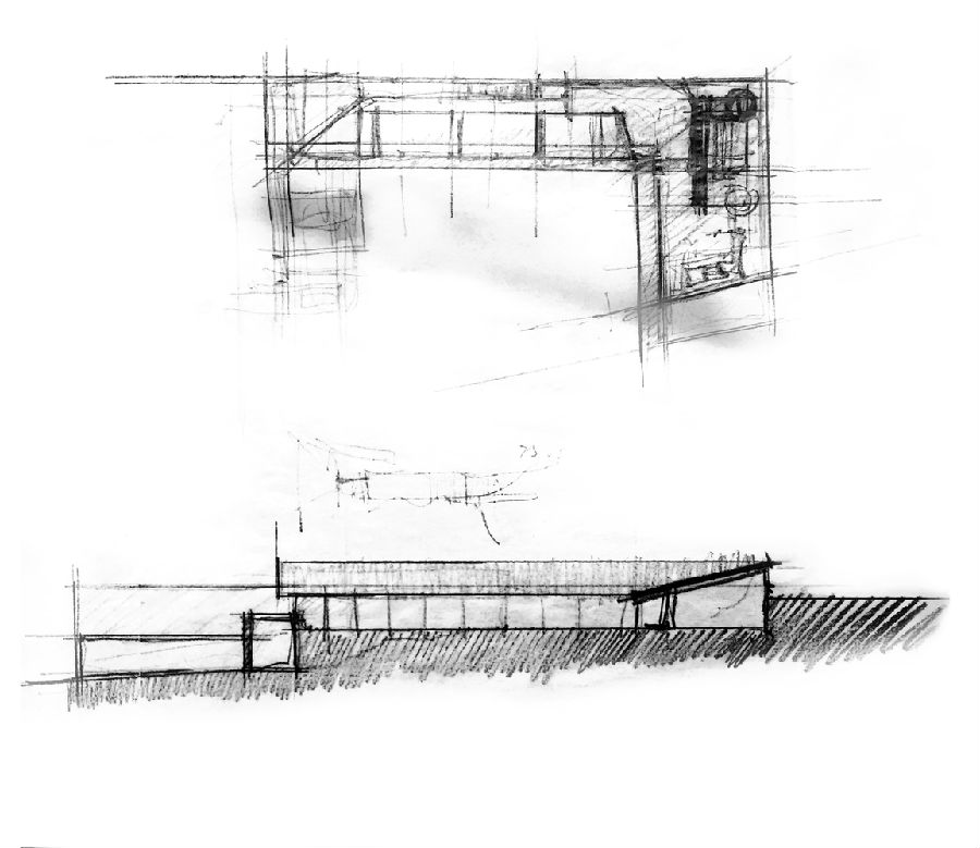 就建造过程而言,这座住宅可以看成是一种由“面”构成的游戏,与空间和体量等三维元素语言的关联度不大。因此上述的混凝土墙是服务于首层平面的边界性面元素;木制表面构成了朝向花园的围合面;最后还有一块巨大的锌板形成倾斜的平面,悬挑于墙的上方。事实上,这部分的结构是以金属柱子为支撑从墙上悬挑而出,这部分同时也由花园四周的立面墙体支撑重量。