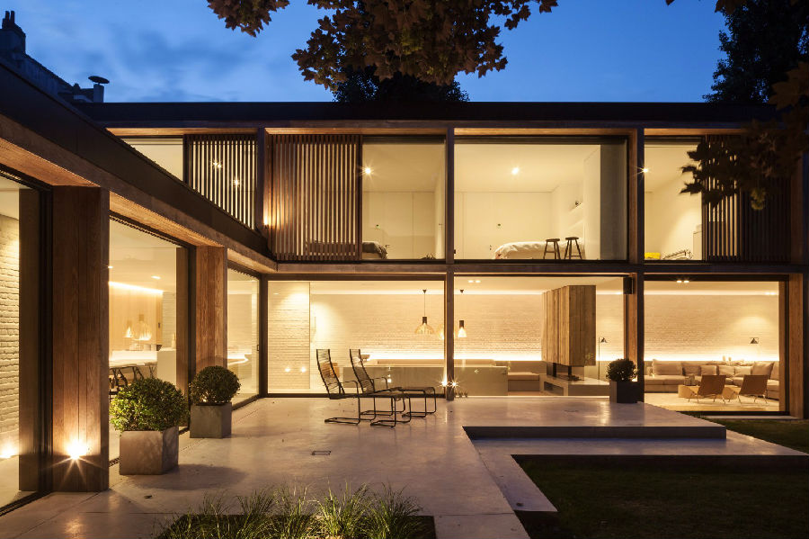 比利时工作室Steven Vandenborre在一座根特的家庭住宅后方添加了一个体量,建筑师运用了大量的玻璃幕墙来突显花园的美景。