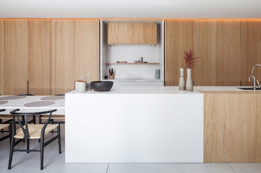 室内设有一个开放式的起居室和餐厅,色调偏中性化。浅色的早餐岛搭配着木质纹理,界定了光线充足的厨房色调,与后面的橱柜相得益彰。