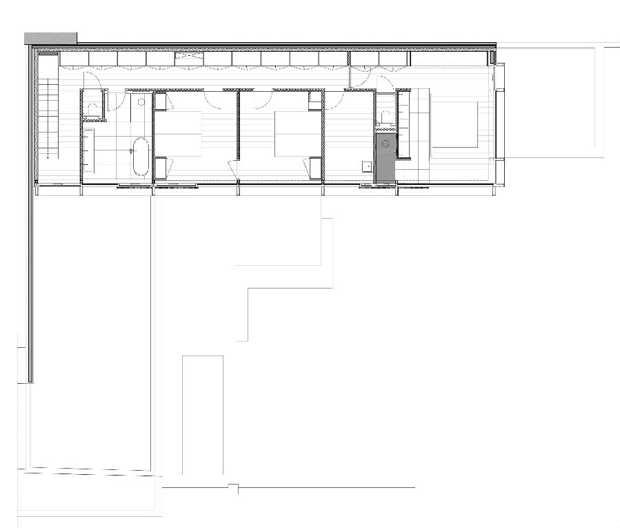 扩建住宅的二层是一个直线型体量,卧室和洗涤区围绕中央壁橱空间布置。精心摆放的木板屏障保护着这层的隐私空间。
